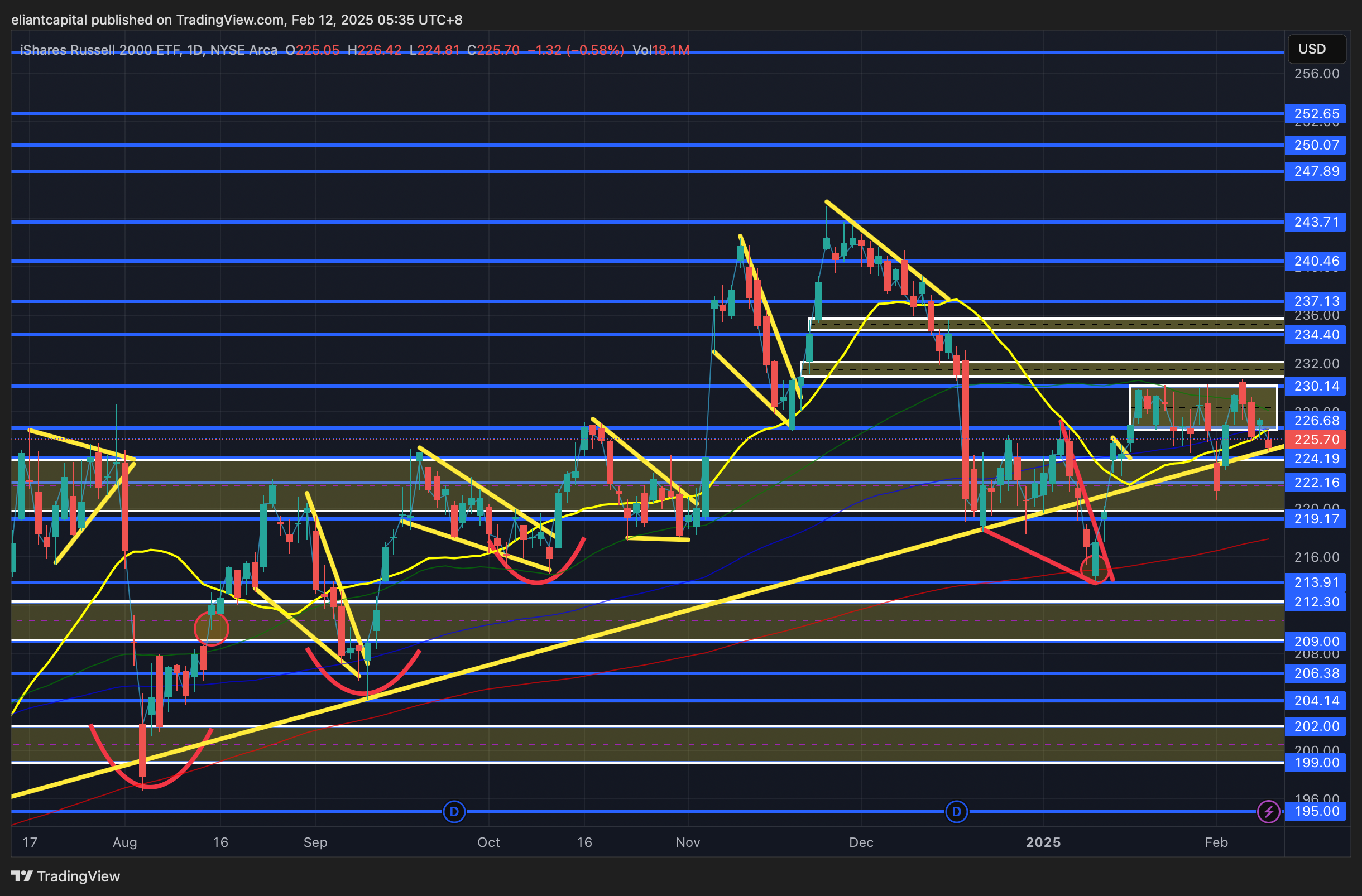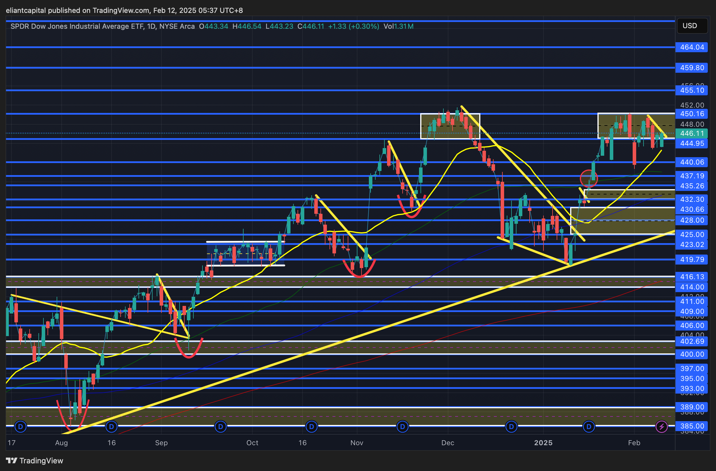 If we do see further followthrough to the downside in DIA / break lower out of the contained range gets continuation to the downside, DIA should likely work lower to 440ish (50d sitting just below as well near 437ish) which is where DIA initially bottomed this prior Monday (3rd of February) & do expect that general area to continue to be a more firm support… however, if it were to falter, we likely will see DIA start to work lower to the bull-gap below in the lower-430s & ultimately, 430ish remains as a bigger LIS as it coincides with the big CPI bull-gap from earlier on in January highlighted below & more so should act as a bull / bear LIS… faltering below should lead to a gap-fill into the 425s, but as long as the bull-gaps below remain supportive (highlighted demand zones), bulls will continue to remain with edge on a medium / longer-term timeframe