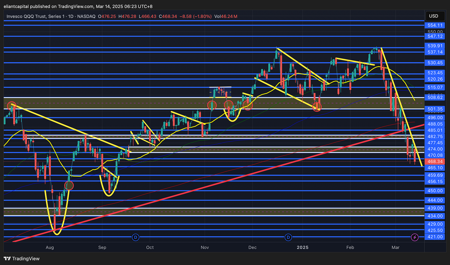 Again, the steep downtrend within indices has continued & DIA was the last index to firmly break below the 200d earlier on this week as now all indices remain firmly below the 200d… As of now, DIA has fallen back towards the Summer ‘24 highs & resides just below, but in general, it still remains as an important pivot as it has potential to be a S/R flip (prior resistance flipping to support / important weekly close as could produce a look below and fail). If we were to see a countertrend rally in DIA, I do think we could see DIA backtest 425 / 430ish above before then pausing & or deciding where to go from there… a lower high & or resume towards ATHs being the bigger question…