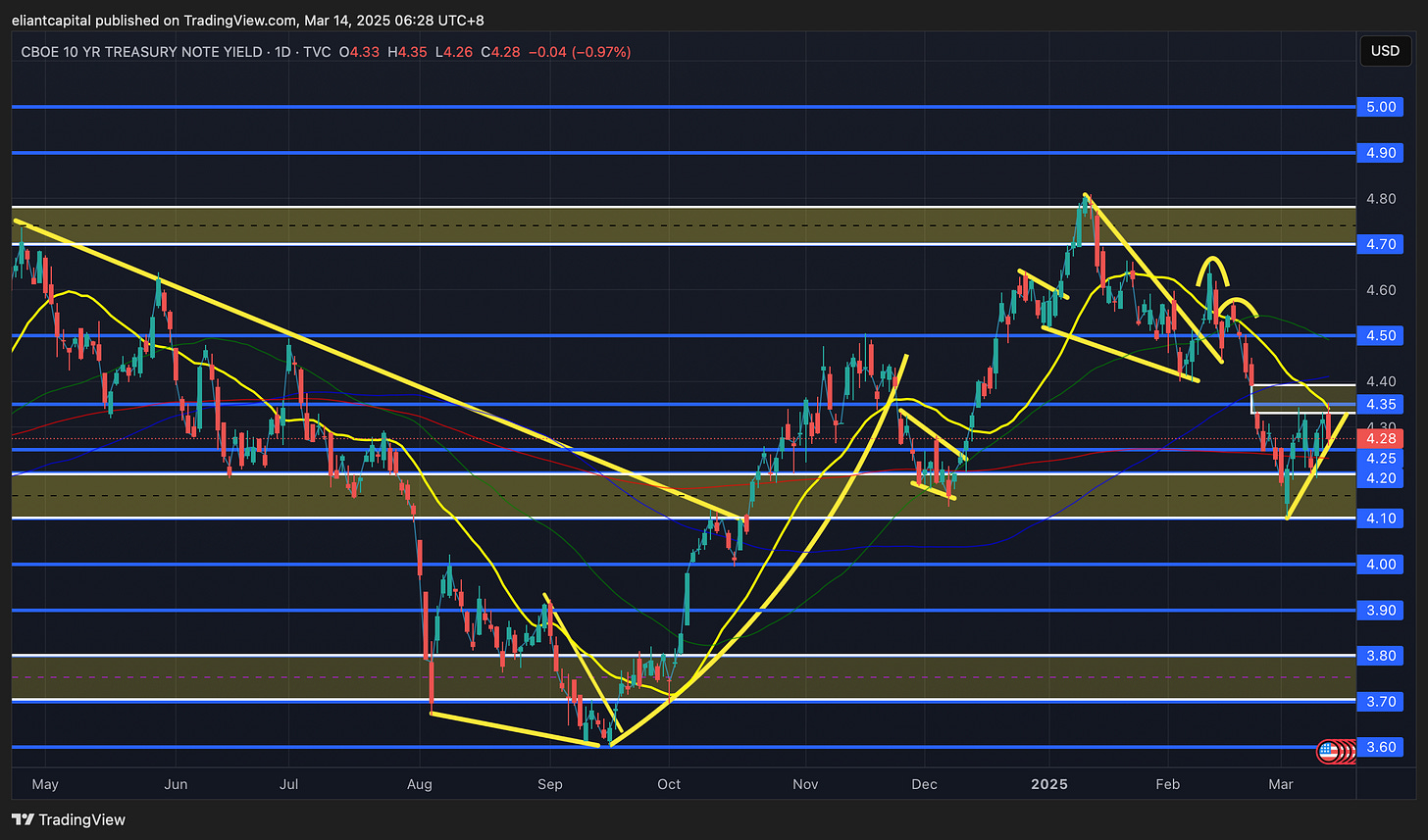 It’s been quite the week in the indices as the vast majority have declined by over 400bps on the week & despite the general risk off action within equites, bonds have still barely caught a bid… & that’s also despite softer than expected CPI & PPI #’s this week… so what’s the issue? As we talked about earlier, but PCE #’s for this upcoming print continue to be revised up due to components that feed through PPI that reflect in PCE coming in a bit hotter than expected today & the other issue more so boils down to both Germany & Japans bonds as yields continue to rise over there hence putting pressure on U.S. yields. Considering the main goal for this administration that has been repeatedly stated over and over again is to get the 10Y down… well, 10%+ corrections within all of the indices & the 10Y having only fallen to 4.28 from 4.55s is hardly any progress.