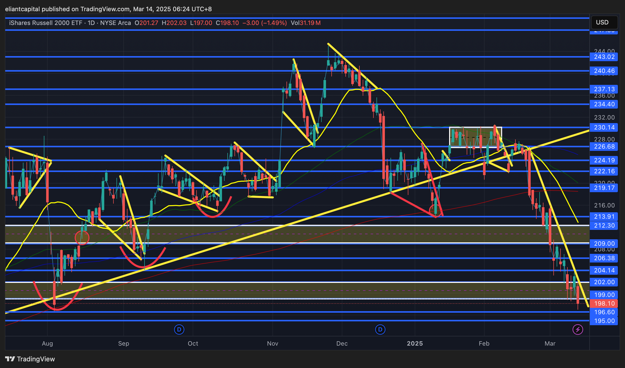 If we were to see a countertrend rally, I do think we could see small-caps retreat upwards towards 212 / 214ish above to backtest the 20d before potentially pausing & resuming lower & or if data abides / growth scare & or fears simmer down along with disinflation resuming, we likely could see the small-cap rally have holding power (data has been great this week, but it more so boils down to some sort of resolution with recent uncertainties in regard to tariffs & or at least some clarity in that aspect… otherwise the volatile action will likely remain).