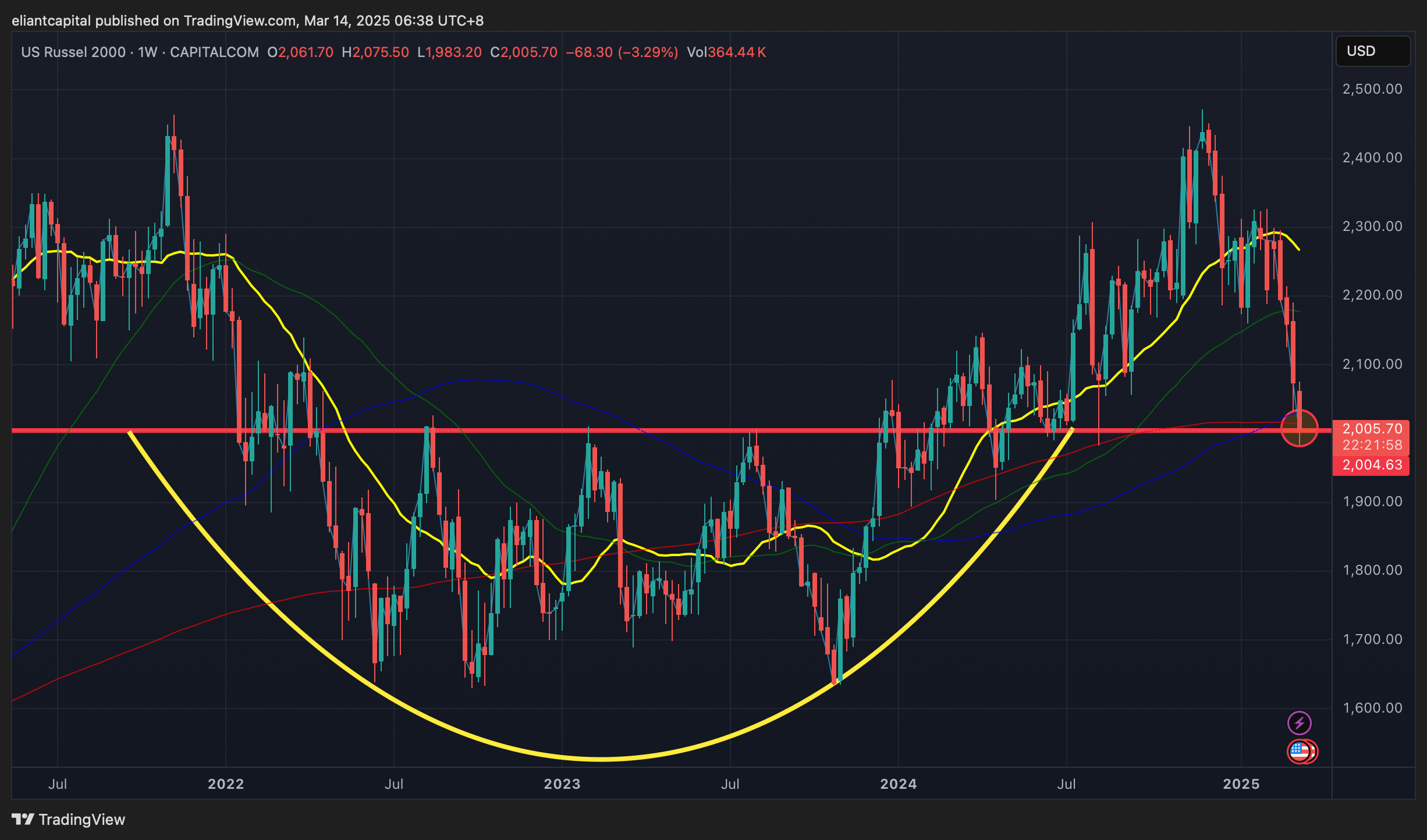The lackluster action in small-caps has continued as IWM sits lower by just under 400bps on the week & small-caps in general have made their way back to quite an important pivot… small-caps briefly broke below the 200wk today (reclaiming it as I type in the OVN session), but in looking below, small-caps are currently backtesting the 200wk which is a very big pivot in itself, but also backtesting the 2+ year breakout that led to the rally in small-caps in ‘24… the ultimate S/R flip (prior resistance flipping to support).