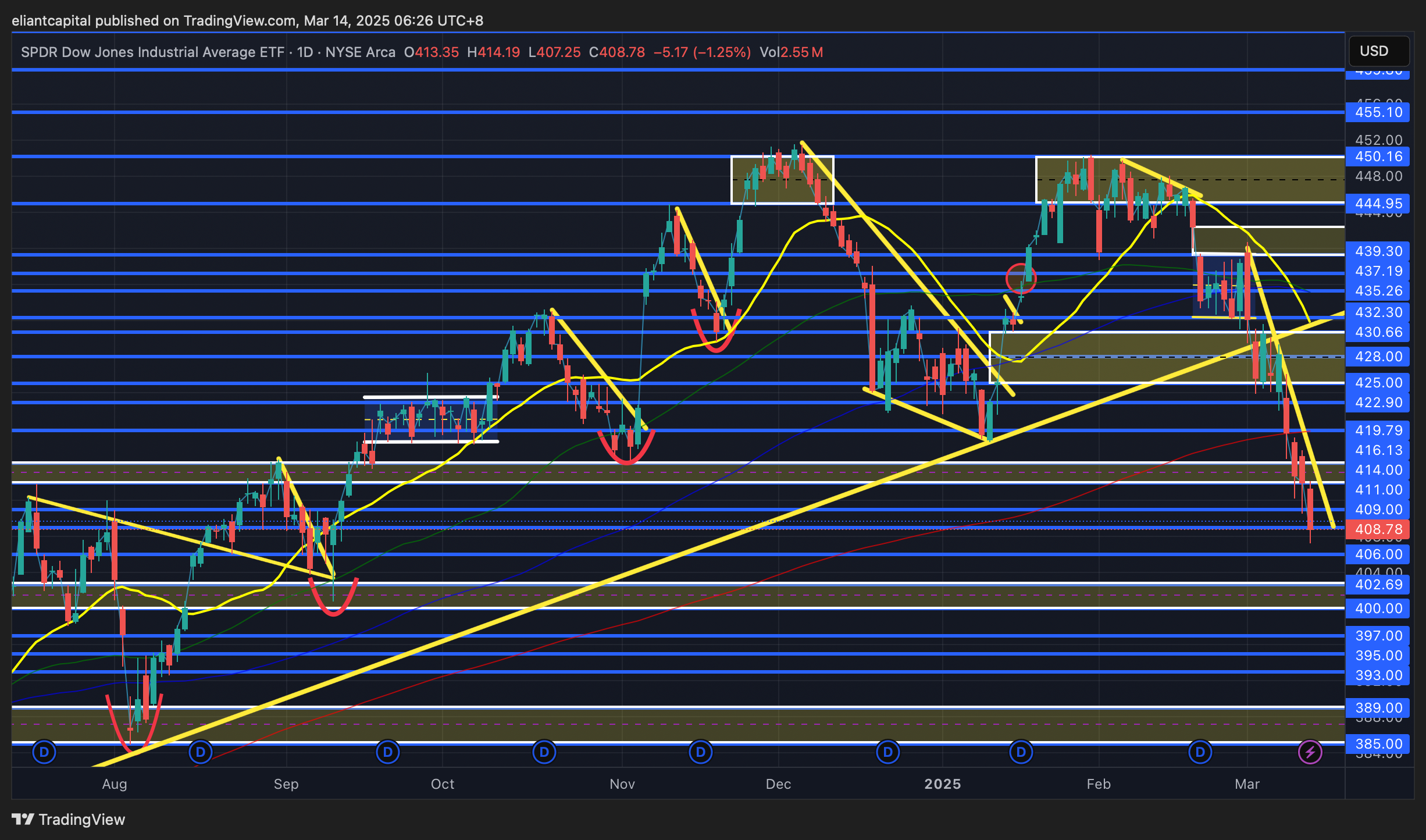 On the contrary, if we were to see DIA continue to fall, the next bigger line of support is around 402 / 400ish which coincides with the September ‘24 lows but in general, barring a collapse due to a headline / outlier event, do think DIA is nearly at the point of reaching extension to the downside before a countertrend rally unleashes.