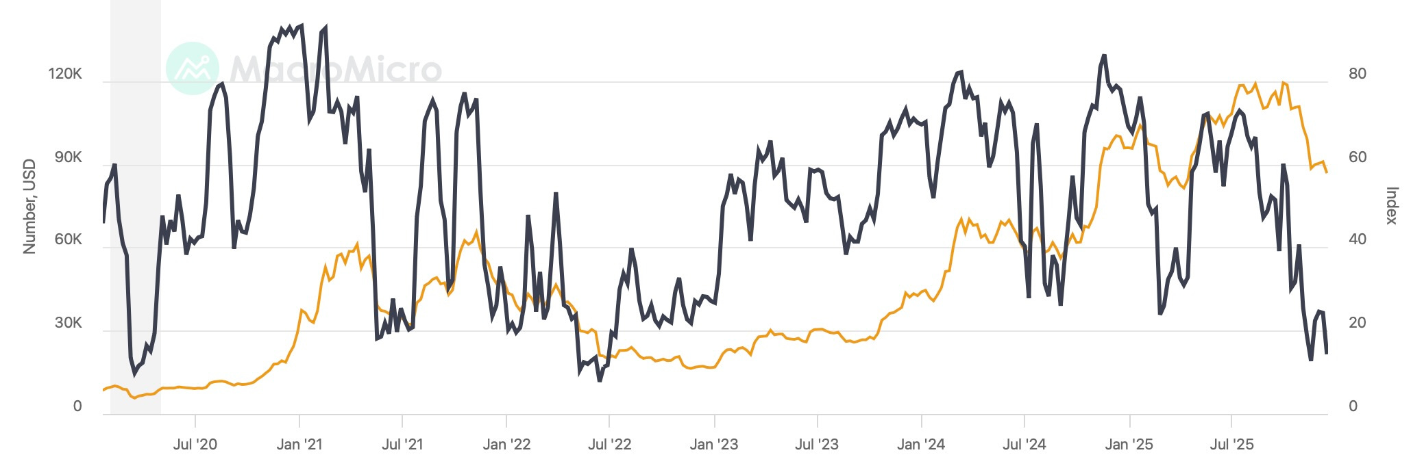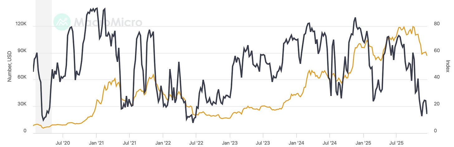 And another interesting highlight given how correlated Bitcoin has been with Higher-beta / the AI-trade is the Fear-Greed index is nearly encroaching the ‘22 Bear Market lows which more so highlights the carnage within Higher-beta / Momentum-driven names as well despite the indices being hardly off the highs.