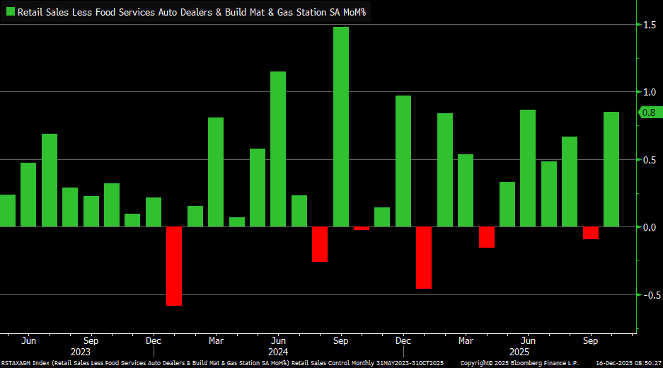 On the consumer side however, retail sales offered a more constructive signal than the labor data might suggest. The control group, which feeds directly into GDP calculations, rose 0.8% in October & the strength stands in contrast to the steady rise in the unemployment rate to new cycle highs. Whilst the labor market is clearly cooling / normalizing, underlying consumer spending has remained resilient, suggesting that growth is slowing but not rolling over entirely. For now, consumption continues to act as a buffer for GDP, even as employment conditions soften and forward-looking risks around income growth begin to build.