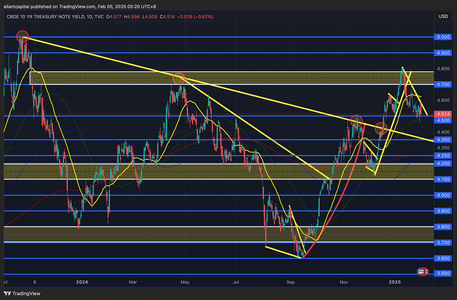 In regard to the 10Y, again, I think the question boils down to whether or not we found a bottom near 4.5 & are about to resume higher & or if we have a flush lower coming… given the rejection off the downtrend today, it does seem like the 10Y wants to flush lower, but it likely will depend on QRA tomorrow & jobs data throughout the remainder of the week. If we were to see 4.5 on the 10Y continued to be supported & it starts to work higher, we may go on to retest 4.8s but could also make a potential lower high near 4.65 / 4.7ish, but if we do start to see the 10Y resolve lower, we likely will go on to test 4.4 / 4.35ish below… at the end of the day, my opinion hasn’t changed as bonds seem rangebound between 4.35 / 4.8ish until proven otherwise & we either need to see further confirmation of disinflation resuming & or economy slowing to see the 10Y break lower & or inflation fears pick back up again / economy continues to run hot to break higher… otherwise, the range-bound action & flipping back & fourth between narratives will remain.