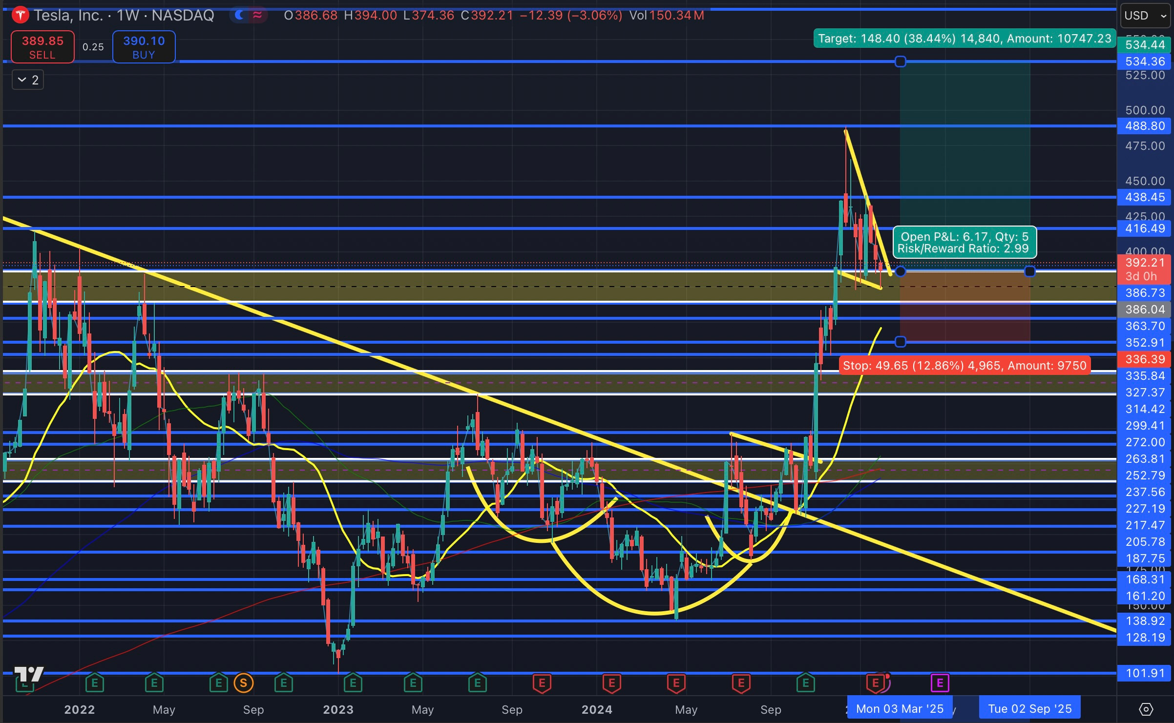 I have been eyeing a re-entry in Tesla & have been pretty patient with a re-entry after we initially crushed Tesla to the upside via call spreads as a stock replacement trade which we put on in September of last year for February expiration & netted a 4X on the remainder of our position, but they ended up going max-gain… since, Tesla has recently corrected 20%+ from the highs & given that Mexico / China / Canada didn’t respond with a tariff on Tesla which was an initial thought on my mind in regard to why I have held back, but these levels look fairly attractive from a technical standpoint / entry along with looking for the “Trump Trade” to resume here.