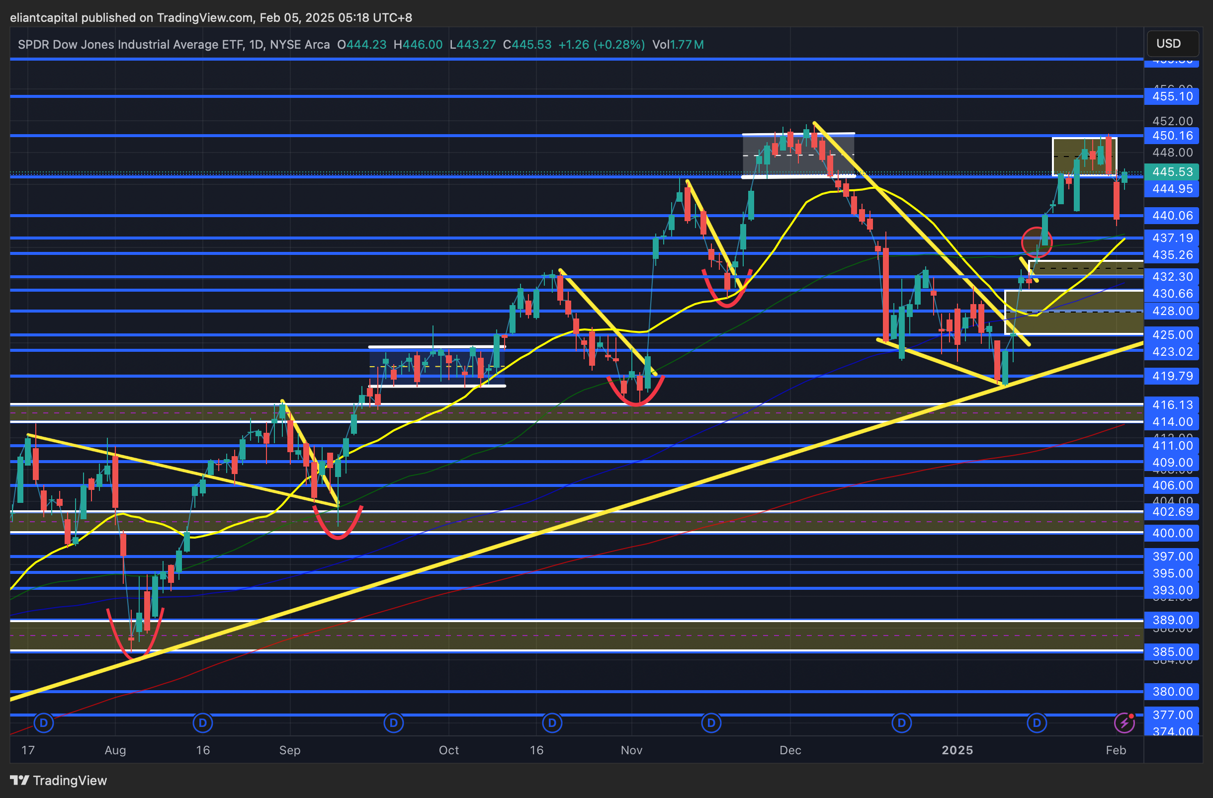 The story hasn’t really changed, but similar to 6100ish on Spooz, but 450ish on DIA continues to remain a stubborn resistance & as long as that remains as such, one can assume DIA will likely undergo some further digestion given it has essentially been vertical ever since bottoming earlier on in January. Given the snapback off of yesterdays lows, DIA once again ended up working right back up towards the prior range (444 / 450ish) from the November / December consolidation period, & it still remains fairly simple, but for further upside & or for the continued rally to be sustainable, bulls still would like to see 450ish flip from resistance to support to signal higher highs, but otherwise, I do think 450ish on DIA needs to be respected until proven otherwise & this past Friday once again proved that thesis.