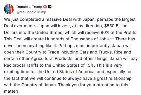 And lastly… a deal was finally reached with Japan. Following the 25% threat from a couple weeks back, the U.S. has settled at 15% reciprocal tariffs with Japan… in terms of major trading partners, that leaves the U.S. with both the EU & China left unresolved & as we just mentioned above but China tariff exp. plans to be extended, so that really just leaves the U.S. with the EU… general point being, interim tariff tail-risks continue to deflate.