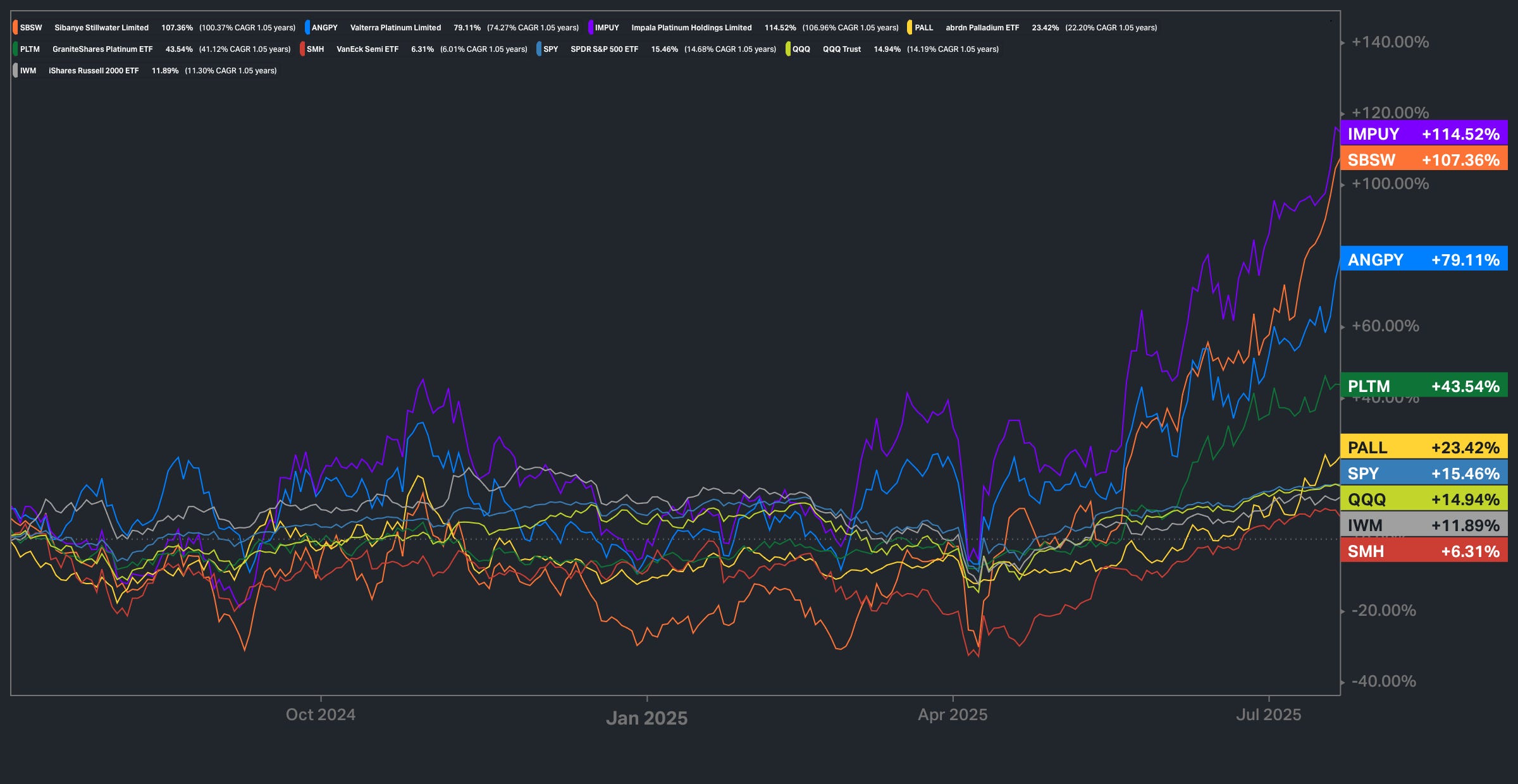 & was PGMs which was viewed as one of the most hated sectors within the market & at the time, no-one wanted anything to do with the sector & now, just over a year later, PGMs as a whole along with respective miners have drastically outperformed U.S. indices… yes, even Semiconductors in which SMH in itself has only returned 630bps whereas an EW basket of PGMs along with the miners is up just over 73%… not too shabby.For those whom did want to go back & read the original write-up, a link can be found here.