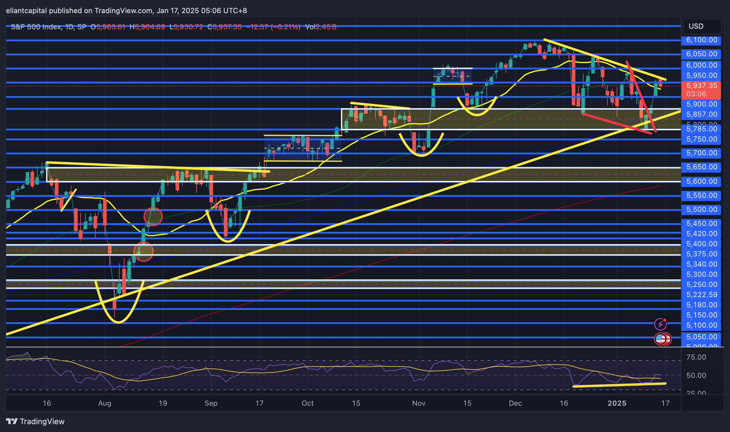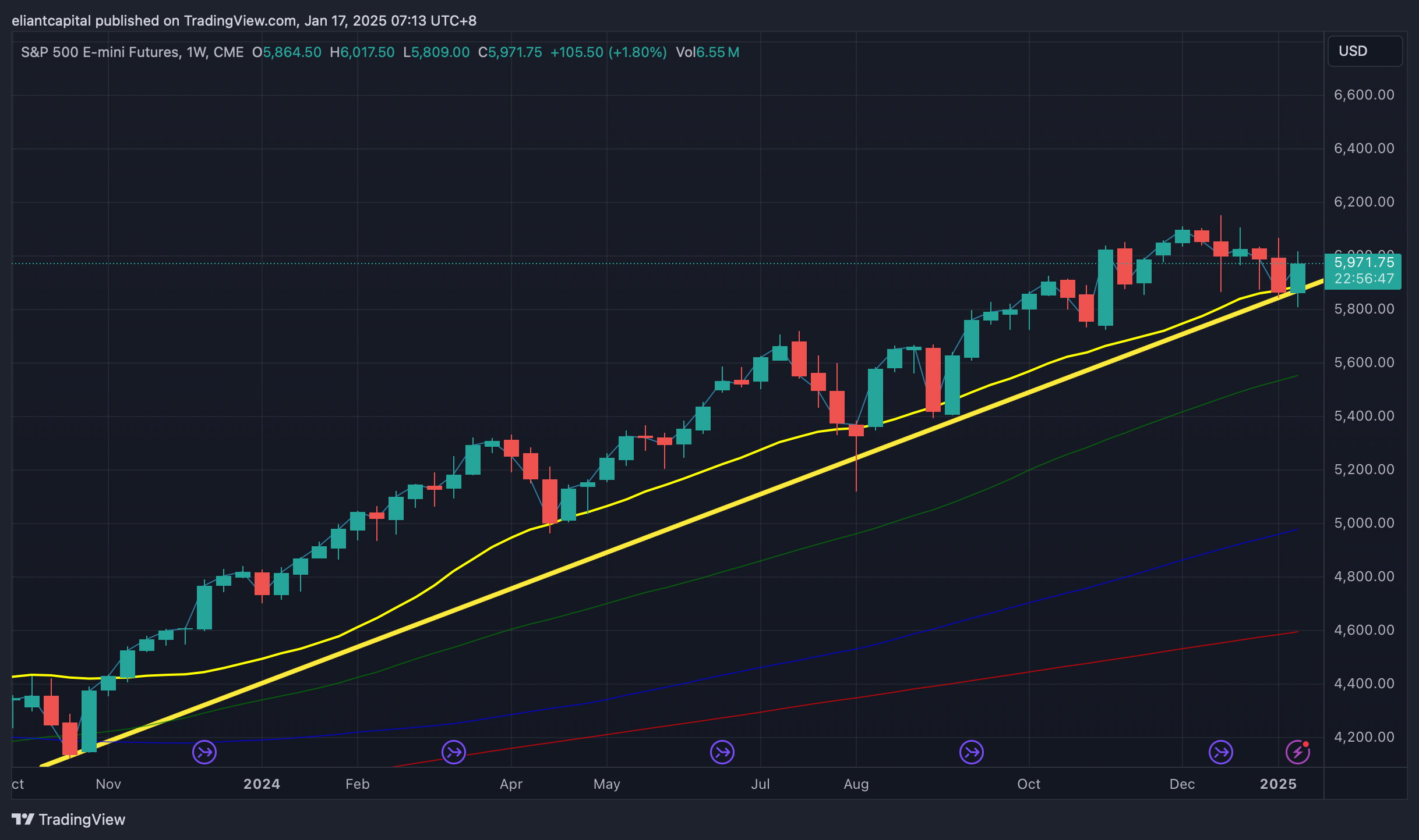 It’s been quite a wild week, but we’ve nearly made it through… Spooz initially kicked off the week with a gap down to fill the election gap into the 5700s & between yesterday & today, Spooz was 40 points at the highs just shy from tapping 6k… nearly a 200 point reversal off the lows. Spooz went on to reclaim the 20wk & now remains firmly above along with the support TL dating back to the late ‘23 lows… fairly constructive look as we head into the remainder of January & kick off ‘25.