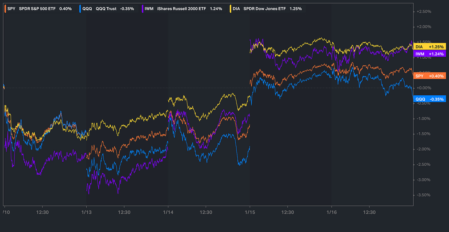 It’s been a fairly active week in the markets, & as the week has progressed, Spooz itself has produced nearly a 200+ handle rally off the Monday lows, & the Dow & Small-caps have been the best performing of the indices on the week (softer than expected inflation data as a contributing factor) as we have finally found some relief in bonds as well as capital shifting out of the Q’s (worst performing index on the week) which has more so led to this rotationary action in the markets these last few days & as a result, expanded / broadened out breadth making action much more healthy & sustainable across the board.