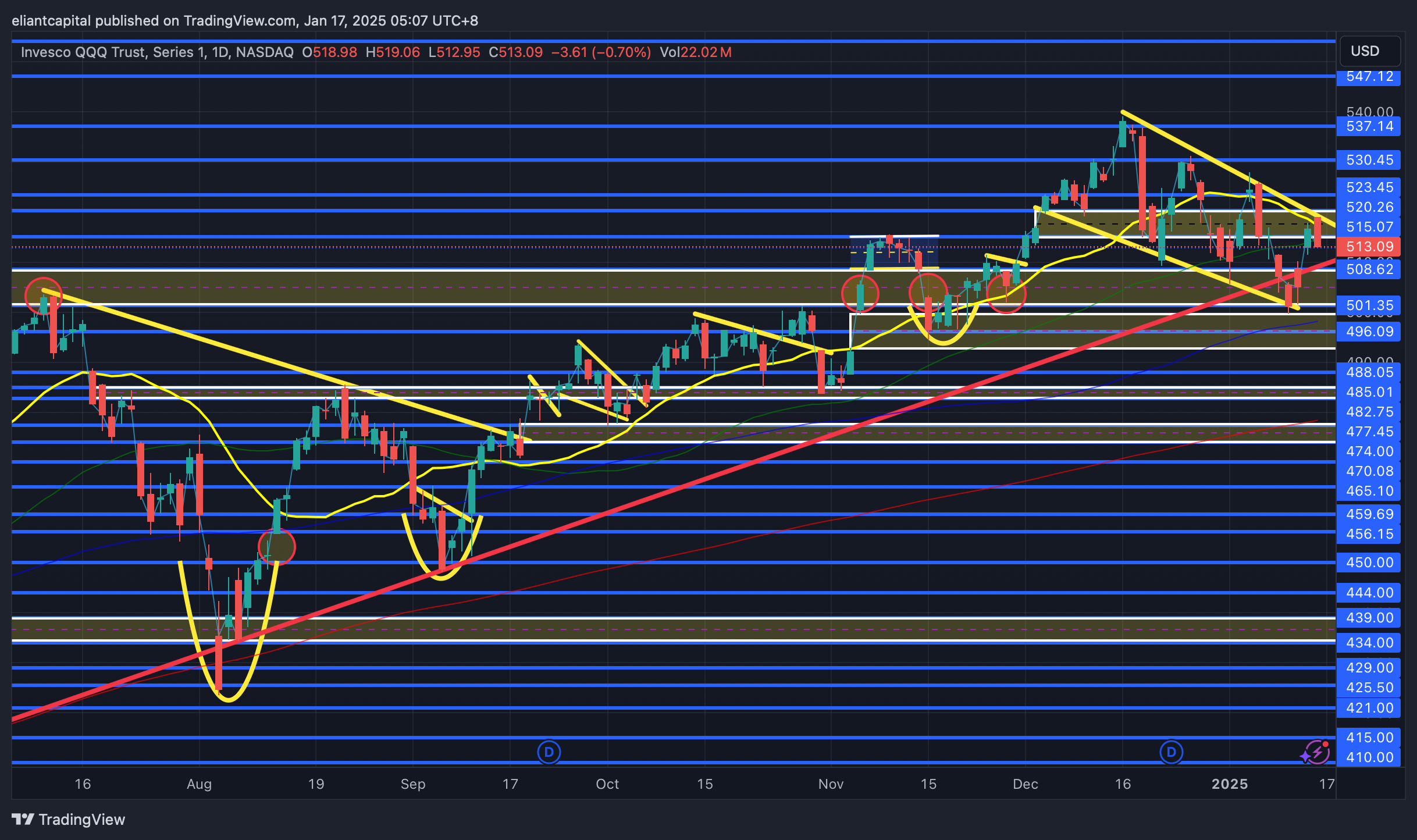I would still argue that bulls have slight edge as long as the prior highs from August near 501ish continue to act supportive (S/R flip) along with this support TL dating back to the August lows for added confluence & the 100d as well… still think we need to see the Q’s firm up above 515-520ish (reclaiming 50d / 20d) / rejected today, to start to get momentum rolling back to the upside, as otherwise, the Q’s could be susceptible towards a bit more downside action… potentially if this S/R flip were to fail along with the 100d faltering, I could see the Q’s start to work lower towards the election bull gap near the low-490s to close that gap just as Spooz did Monday. It still continues to look like this market wants to rotate / capital wants to shift elsewhere out of tech.