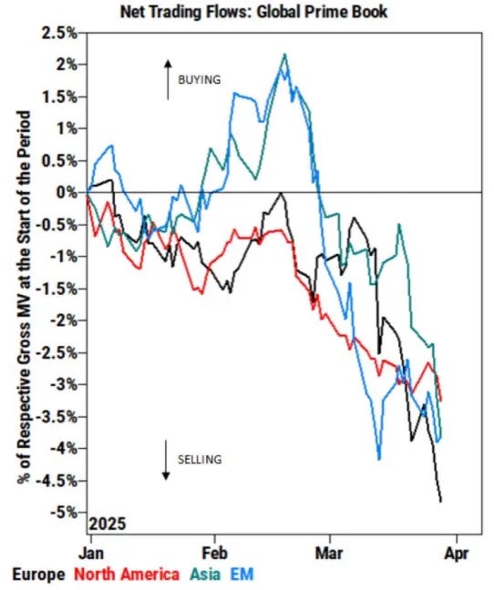 We’ve obviously seen quite the degrossing / negative flows (selling) as the year has kicked off & the following chart below reflects that… what’s interesting is despite the rallies in Europe / Asia / EM, net outflows have reached the same of the U.S. at -3.5 / 5%…