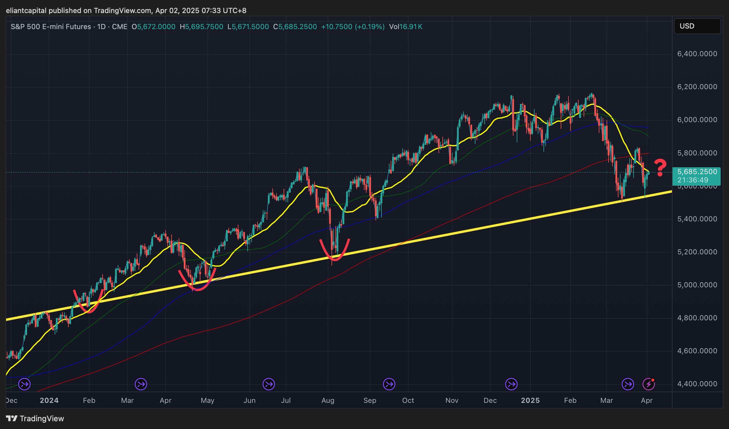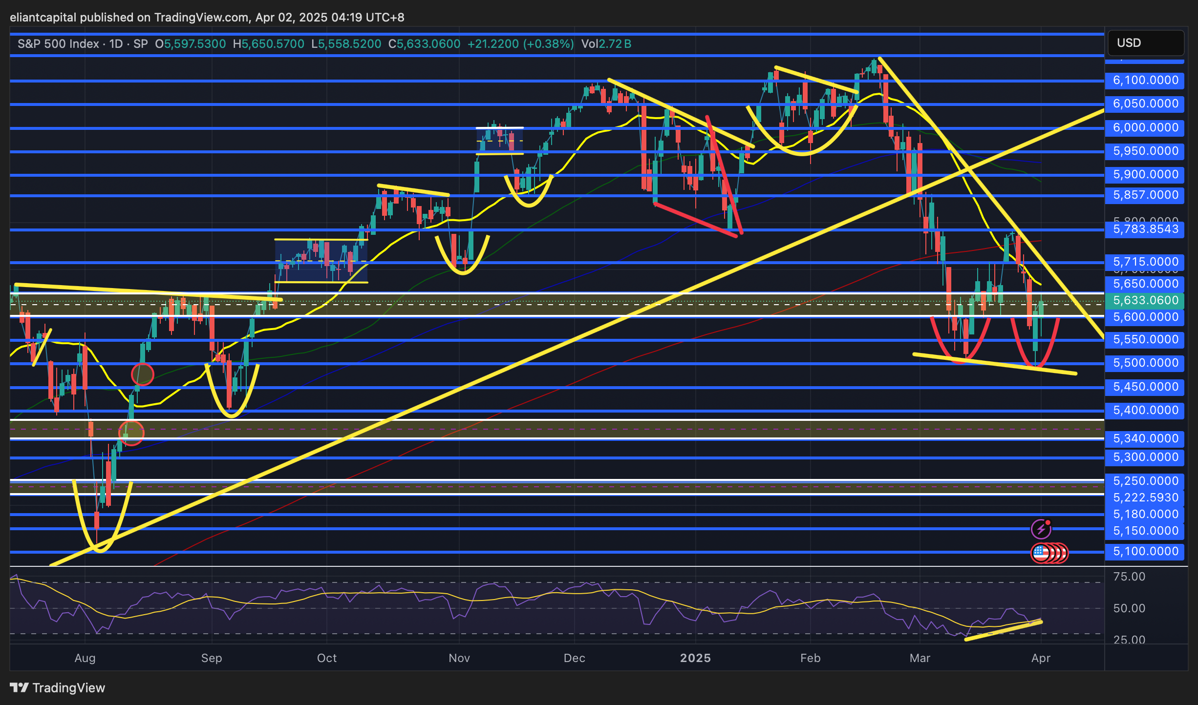 On the contrary, if Spooz were to invalidate this recent bull divergence / falters & goes on to make lower lows, maybe we finally get a flush towards the September ‘24 lows near 5400ish (gap just below near 5340ish as well for added confluence of support)… would likely need to see 20%+ universal tariffs / retaliatory tariffs / bad economic data etc…