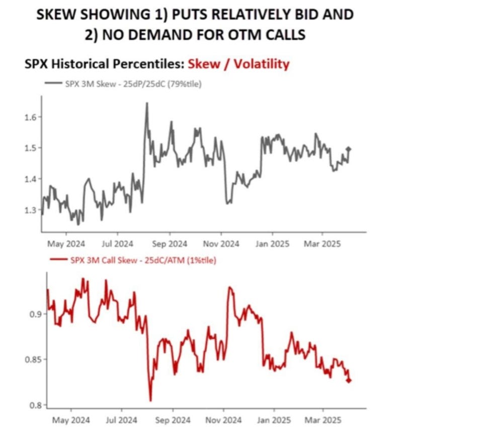 In respect to tomorrow for Liberation Day / Looking ahead, I found the chart below quite interesting… essentially, there is zero demand for calls / right-tail & the market is more so solely prepped & focused on downside as puts still remain relatively bid… what happens if tomorrow isn’t doomsday? Certainly would see a lot of right-tail chasing…
