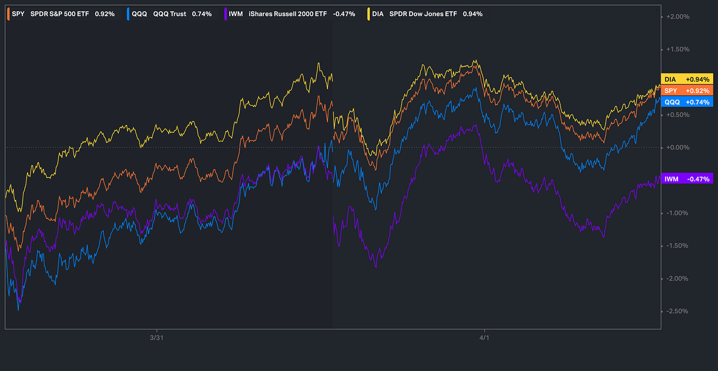 Liberation Day is nearly finally here as Trump is expected to speak tomorrow right at market close around 4pm & as the week has kicked off, the headline volatility has continued with markets initially posting quite the gap down on Monday which did end up leading to quite the snapback off the lows as all of the indices are now within the positive on the week besides small-caps which still remain lower by just under 50bps… not too bad considering majority of the indices at one point were all down 200bps+.