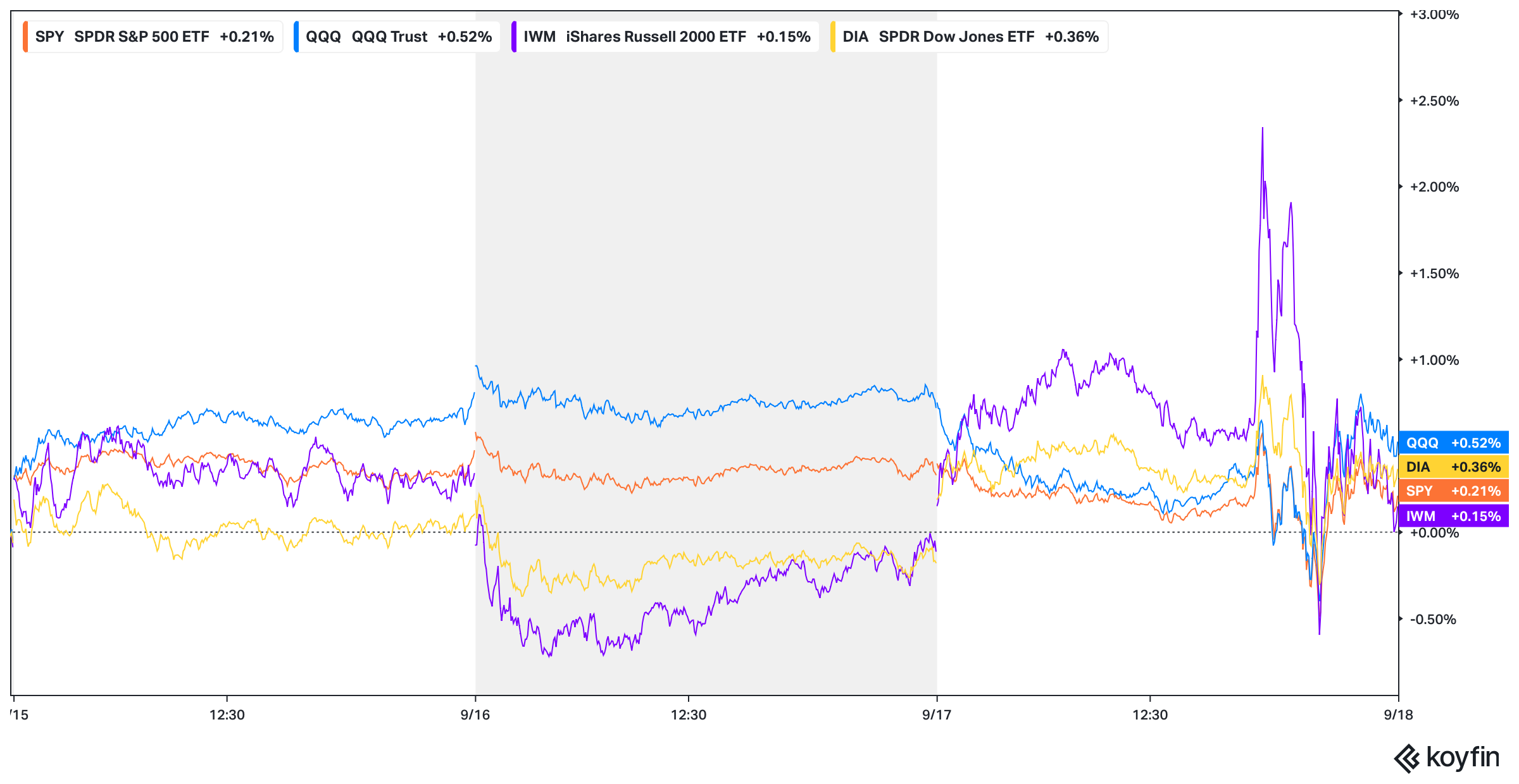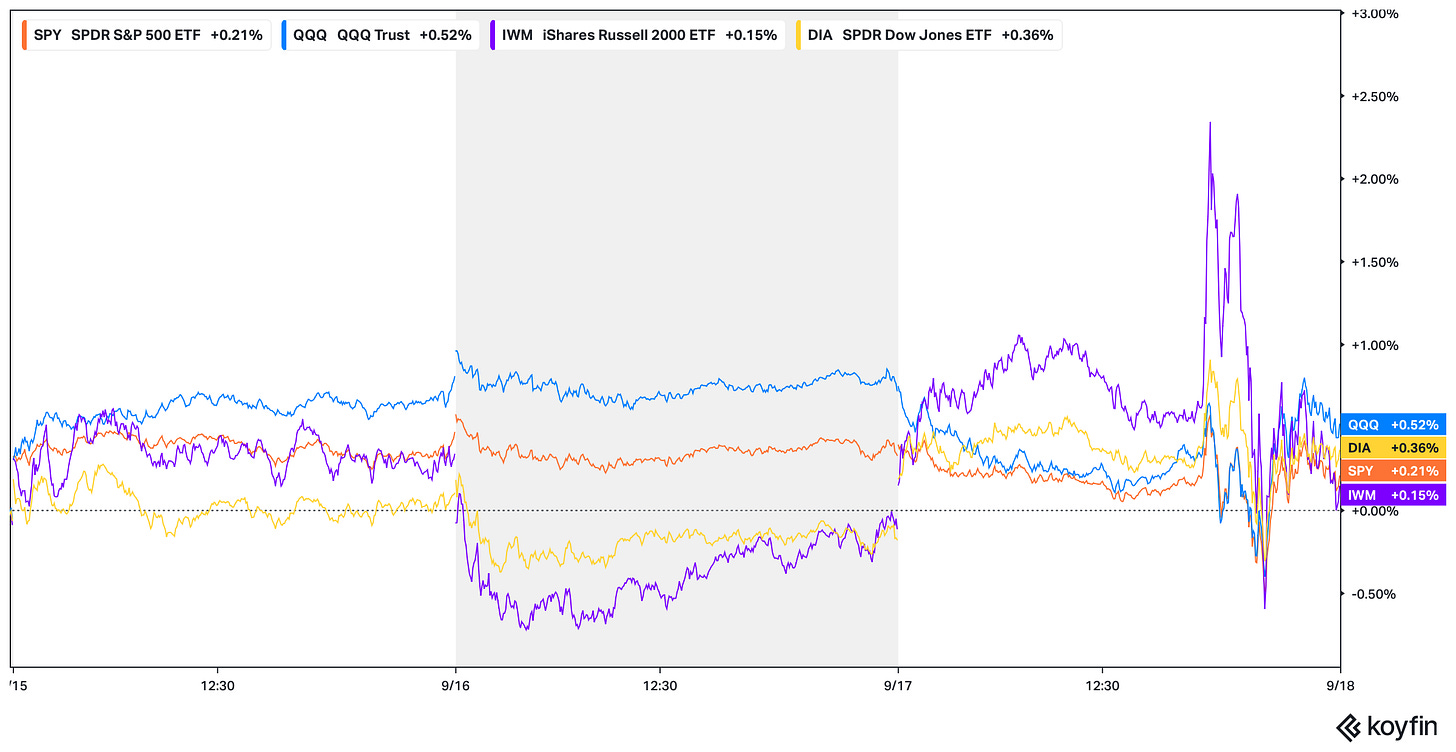 The long awaited FOMC meeting is finally out of the way (No surprises, 25bps & guided for 3-cuts into year-end & or an additional 50bps after today’s meeting) & despite the general event risks on the week, thus far, it’s been a relatively tame one with the Q’s being the best performing of the indices on the week, +52bps, whereas Small-caps have been the ‘worst’ performing of the indices yet still sit higher by 15bps on the week… the disappointment of the anticipated vol expansion continues as the recent & continued slow churn / grindy action persists.