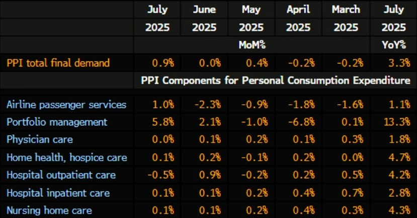 Looking back at the July PPI print, the standout move was a surge in portfolio management fees which tend to rise alongside equities and feed directly into services inflation. Airline passenger services also ticked higher thus adding some upward pressure to transportation services. From a PCE perspective, the outsized driver in July was financial services (portfolio mgmt.), which will lift core PCE services ex-housing & airlines will add modest upside as well. On the other hand however, healthcare components, a heavily weighted portion of core PCE, were flat to slightly softer thus that should help keep the overall inflation impulse from being too hot. And again, the key nuance here is that much of the strength in July came from portfolio mgmt. fees which are closely tied to equity market performance & that more so may make the move more ‘transitory’ and less indicative of underlying inflation persistence.