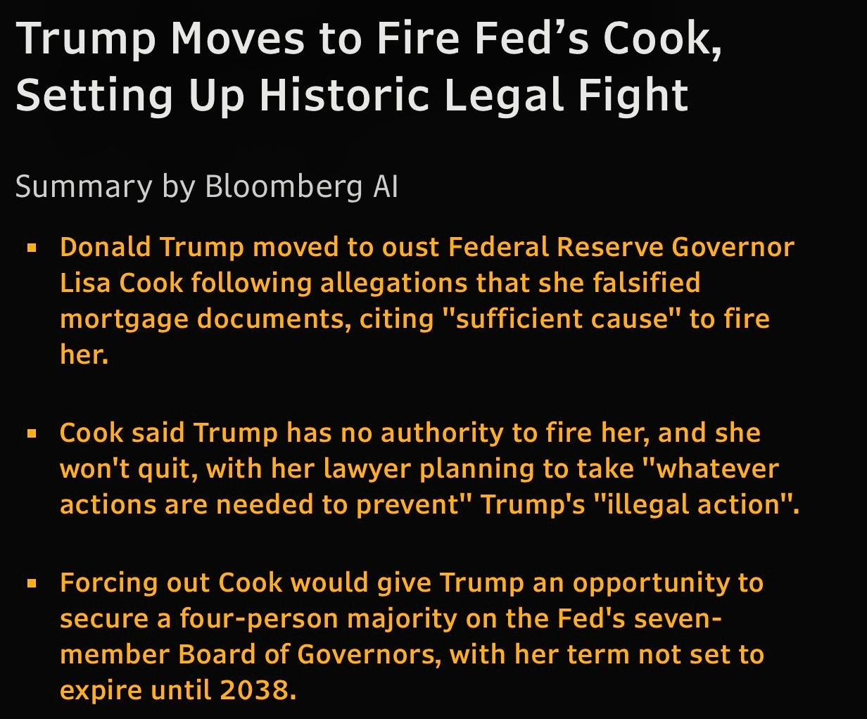 As we’ve been discussing for the past week or so but the motives are clear… Sure, is Cook committing mortgage fraud? Yes, absolutely but the main goal here is to gain control over the Fed board (In order to influence policy) & the firing of Cook would essentially help secure that.