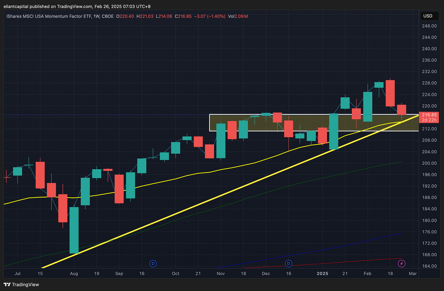 The unwind in momentum has continued this week as MTUM itself has corrected 7%+ from these recent highs… question from here being whether or not if this is just an ordinary backtest of the prior breakout (coincides with 20wk as well) / support TL dating back to the August ‘24 lows (sure looks like it) & or if this pullback in momentum has more legs… personally reside with the former.