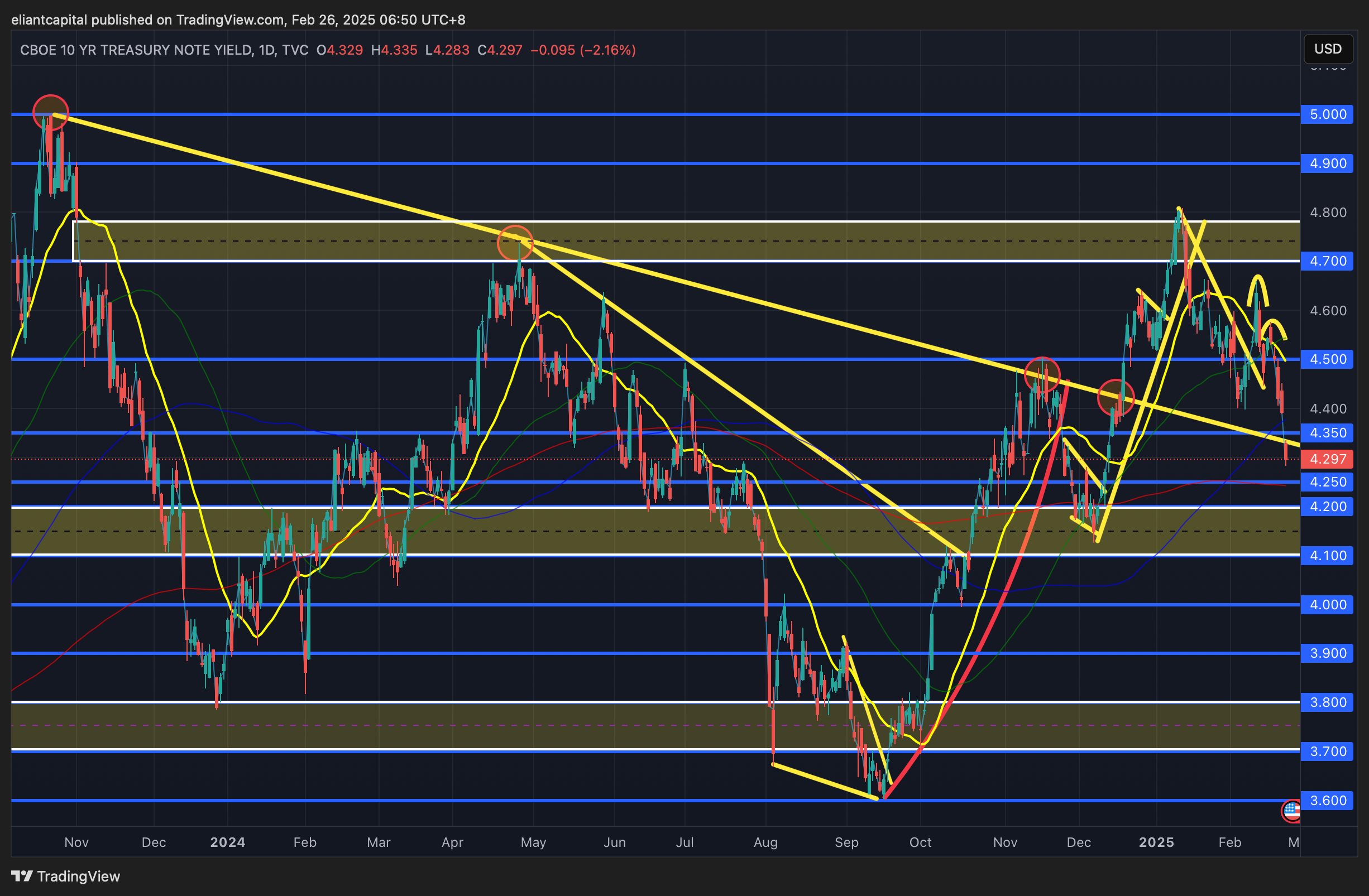 As of now, recent growth scares along with the current admin being adamant on getting the 10Y lower has continued to provide this bid in bonds & it doesn’t seem like that is going away at this moment… again, I think the biggest thing to watch form here will be housing as we already started to see the move in the 10Y be positively reflected towards that sector today as we mentioned above… given housing has struggled with higher rates, this recent bid in bonds is more so stimulative towards the housing market & if it continues, we likely start to see some inflections higher / purchasing applications pick up & if the mortgage rates really start to work lower, refinancing pick back up as well… there still is uncertainties in regard to DOGE and whether or not they will cut spending materially (all noise for now), but for now, it still does look like bonds want further upside / 10Y path of least resistance is lower until this interim narrative changes.