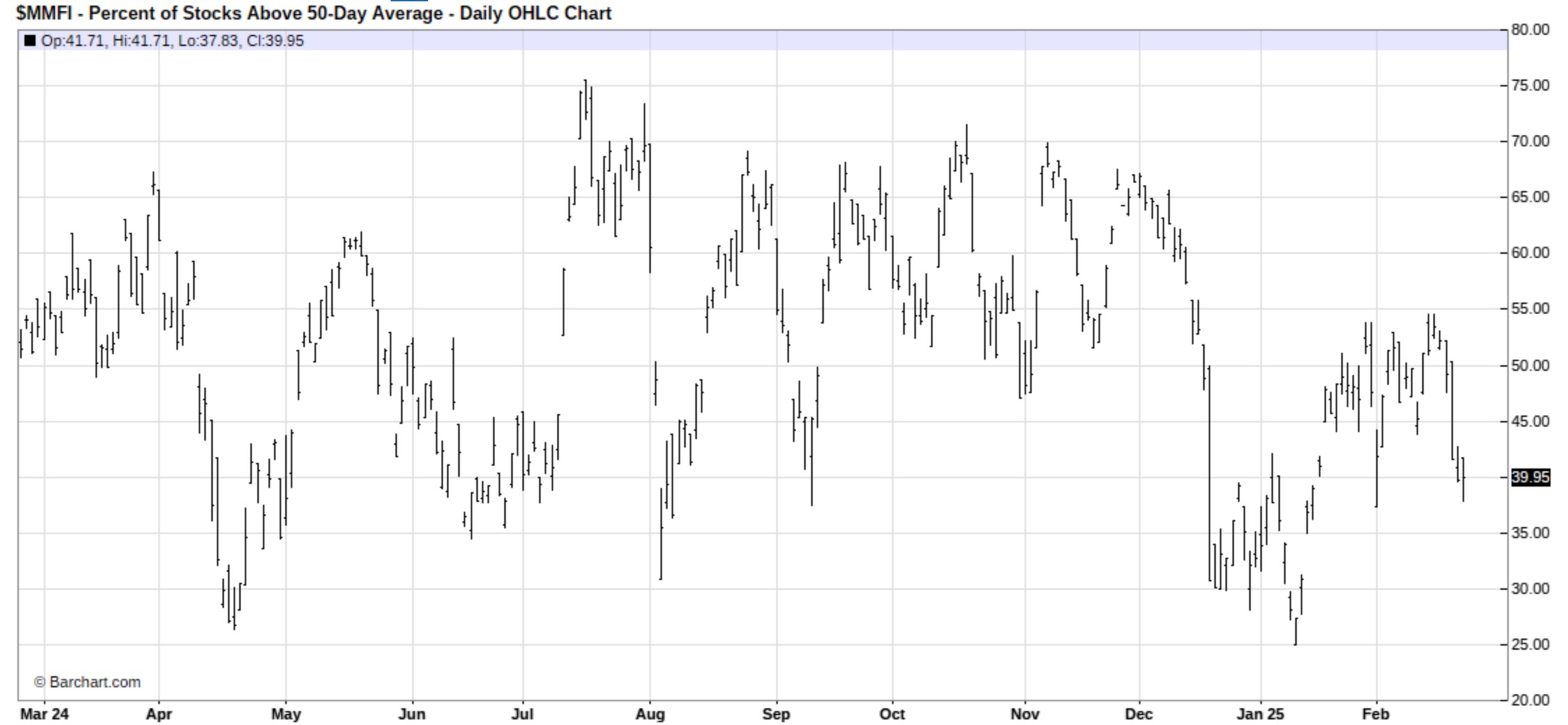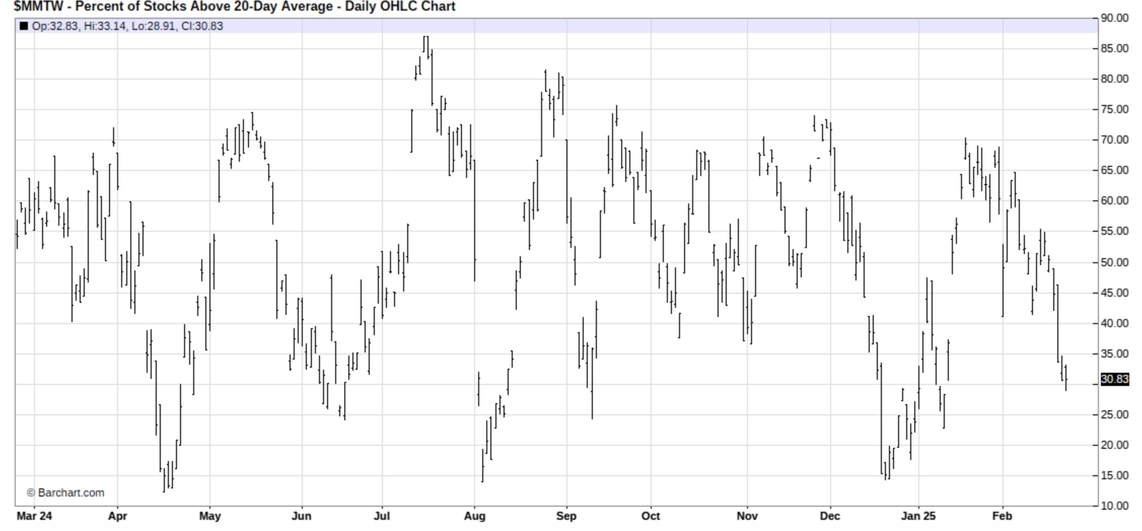 Same story goes for the % of stocks above the 50d MA as well… nearing oversold levels, but not quite to the same extreme of the January lows.