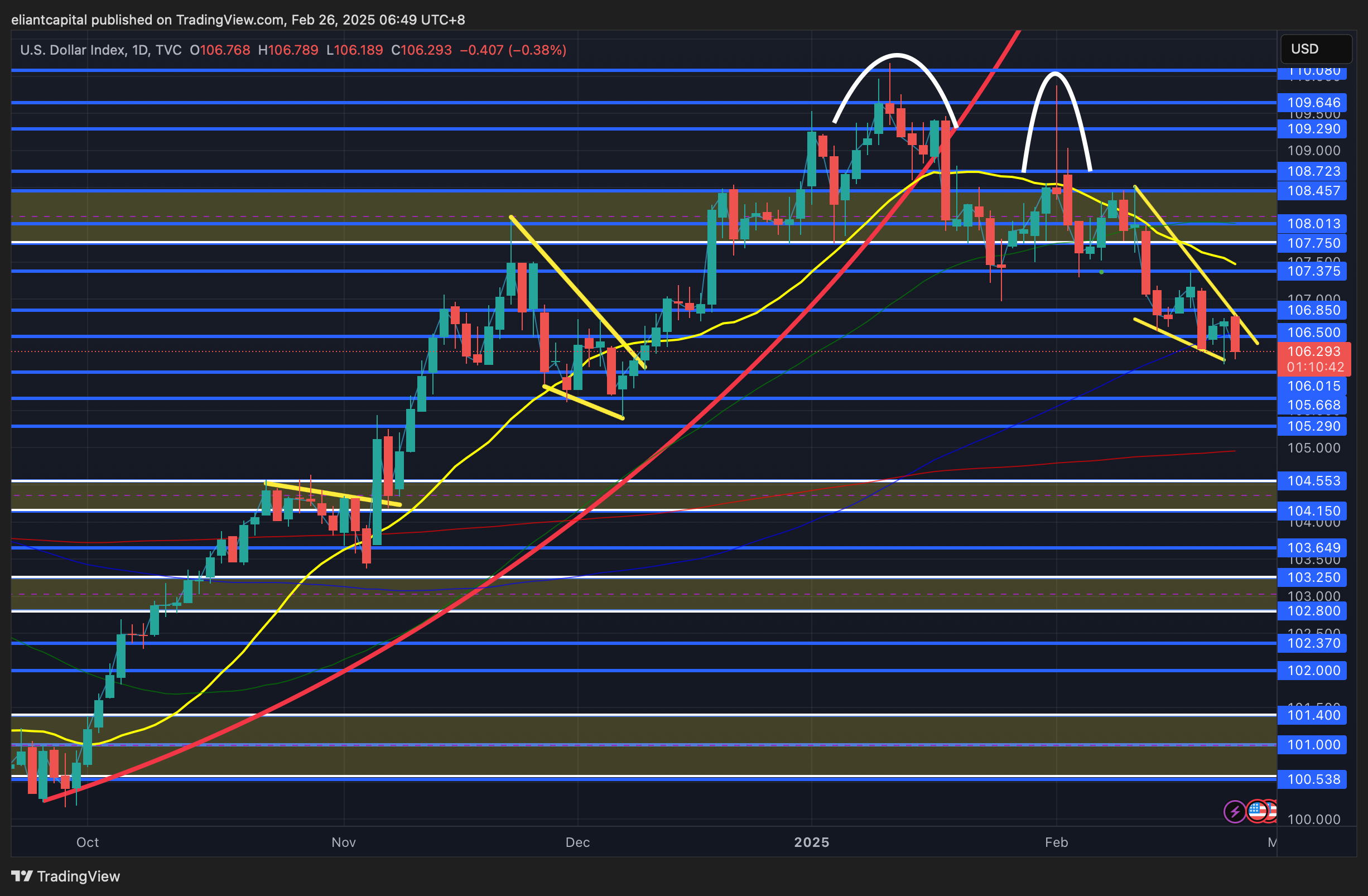 As the week has kicked off, again, there hasn’t been too much economic data to recap but we’ve continued to see further optimism out of Europe & a decline in U.S. exceptionalism which has led to further pressure / weakness in the dollar ever since it made its peak in January near 110ish. As we’ve discussed earlier, but given the read-through from PPI #’s in respect to PCE, it should be a relatively tame report (Friday) which would be a bigger positive for the recent inflation re-emerging fears & we likely would also see that reflected in Fed speakers speeches, as recently, they have been pretty stubborn on the inflation front / need more evidence that inflation is resuming back lower before the Fed can confidently resume the cutting cycle. This should also translate to further weakness in the dollar as well & could even lead towards a flush towards the 200d near 105ish before finding a bigger support, given as of today, the dollar firmly broke the 100d to the downside (although does still remain within this wedge).