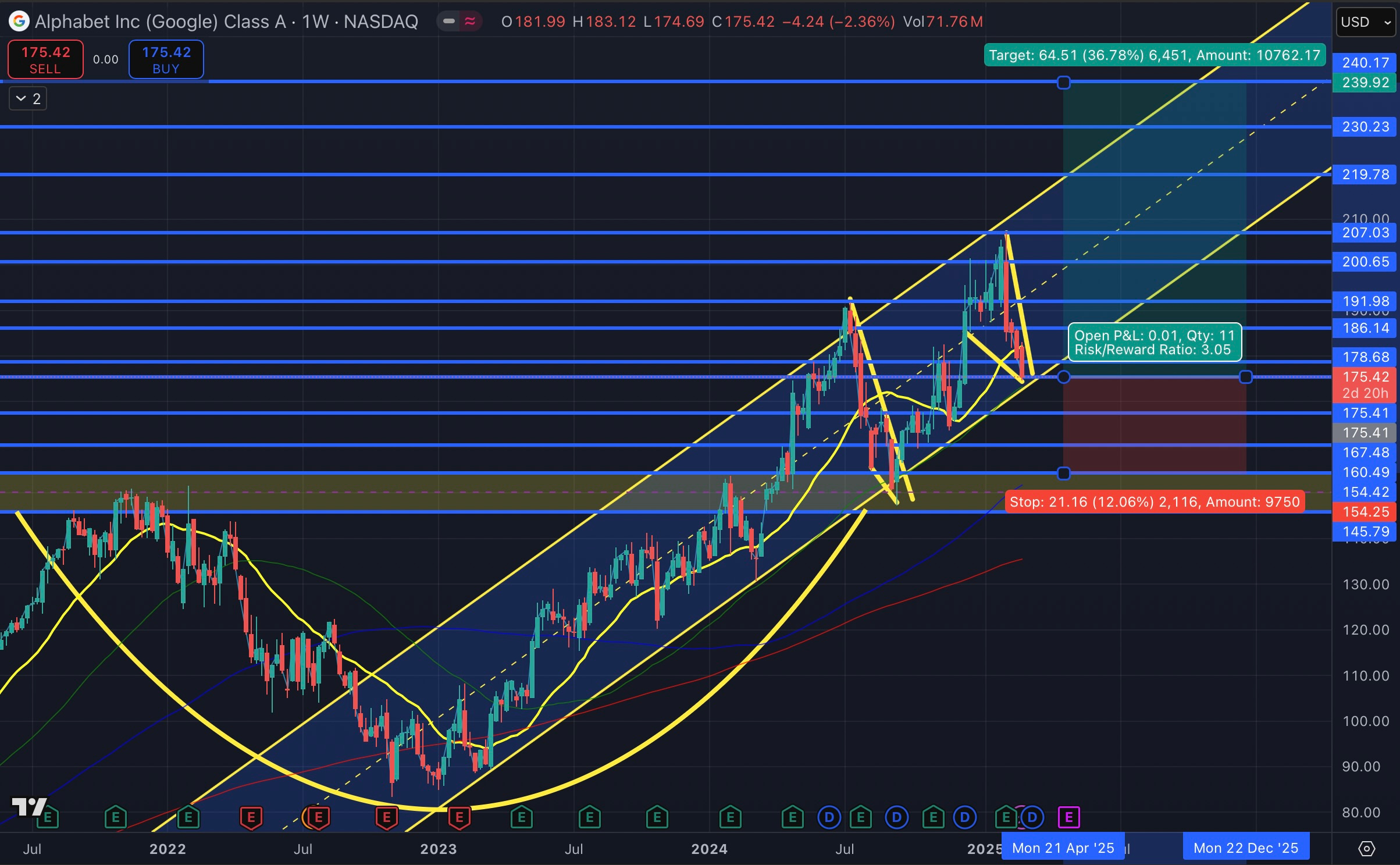 A fairly good technical risk-reward, but as of now, GOOGL closed right on the 200d to round off the day & has made its way back to the bottom of this channel / support TL dating back to the early ‘23 lows… the last time we wrote up GOOGL was around September in ‘24 before it has the rally to 200+ from 150s & this feels like a fairly similar setup… risk essentially being a firm loss of the channel / demand zone below falters as support with interim and extended targets above for a 3.05 risk-reward ratio (long against 154 to target 240).