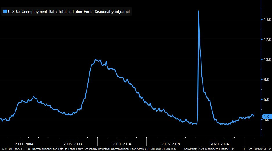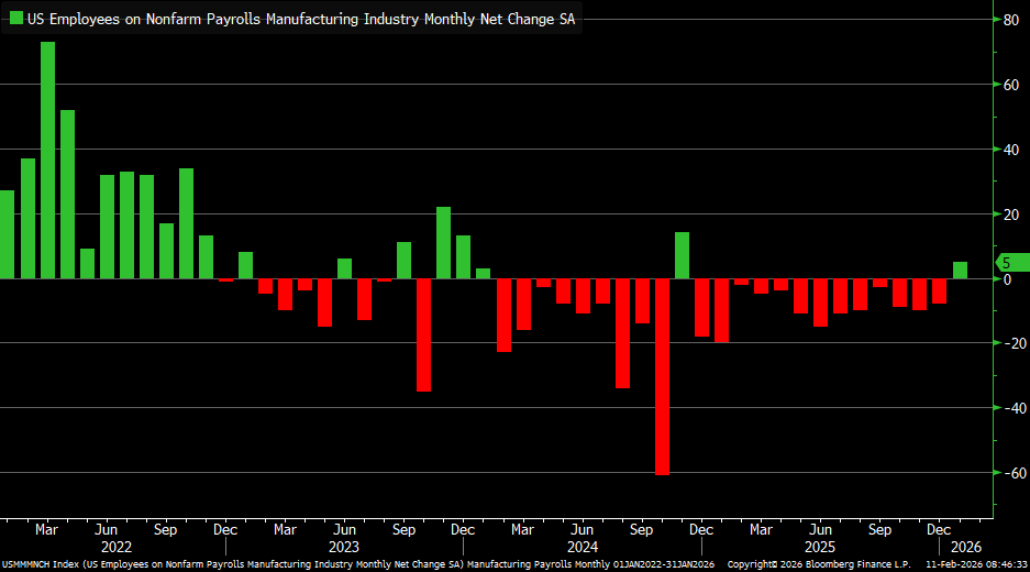 And adding to the point above, today’s jobs report was another clear sign of underlying strength. January Nonfarm Payrolls came in at 130K versus 65K expected, alongside an unemployment rate of 4.3% versus 4.4% expected. Again, the beat reinforces that after a brief wobble in ‘25, the labor market is stabilizing rather than continuing to undergo a slowdown hence the continued pricing-in of an economic re-acceleration (Driving outperformance amongst cyclicals & or ‘real’ economy names).