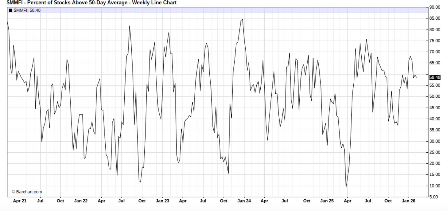 And similar can be said on a more broader timeframe as well as there is still 58% of stocks remaining above the 50D (Neutral Reading) despite the Nasdaq for example remaining below the 50D which just emphasizes the underlying dispersion within the markets: