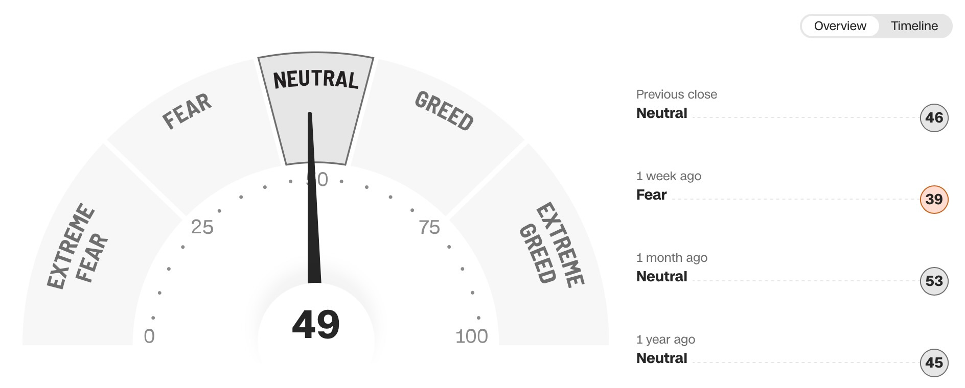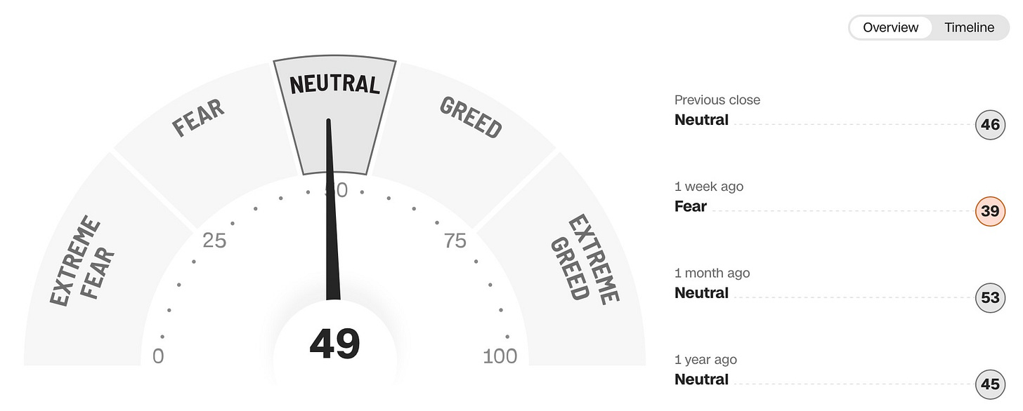 And finally, the Fear-Greed index underscores the point above as well as despite the broadening of breadth & or upside participation given the continued new highs within the Advance-Decline Index, the Fear-Greed index still remains within ‘neutral’ territory which just circles back to the amount of dispersion within the markets along with single stock volatility despite the indices being near their respective highs: