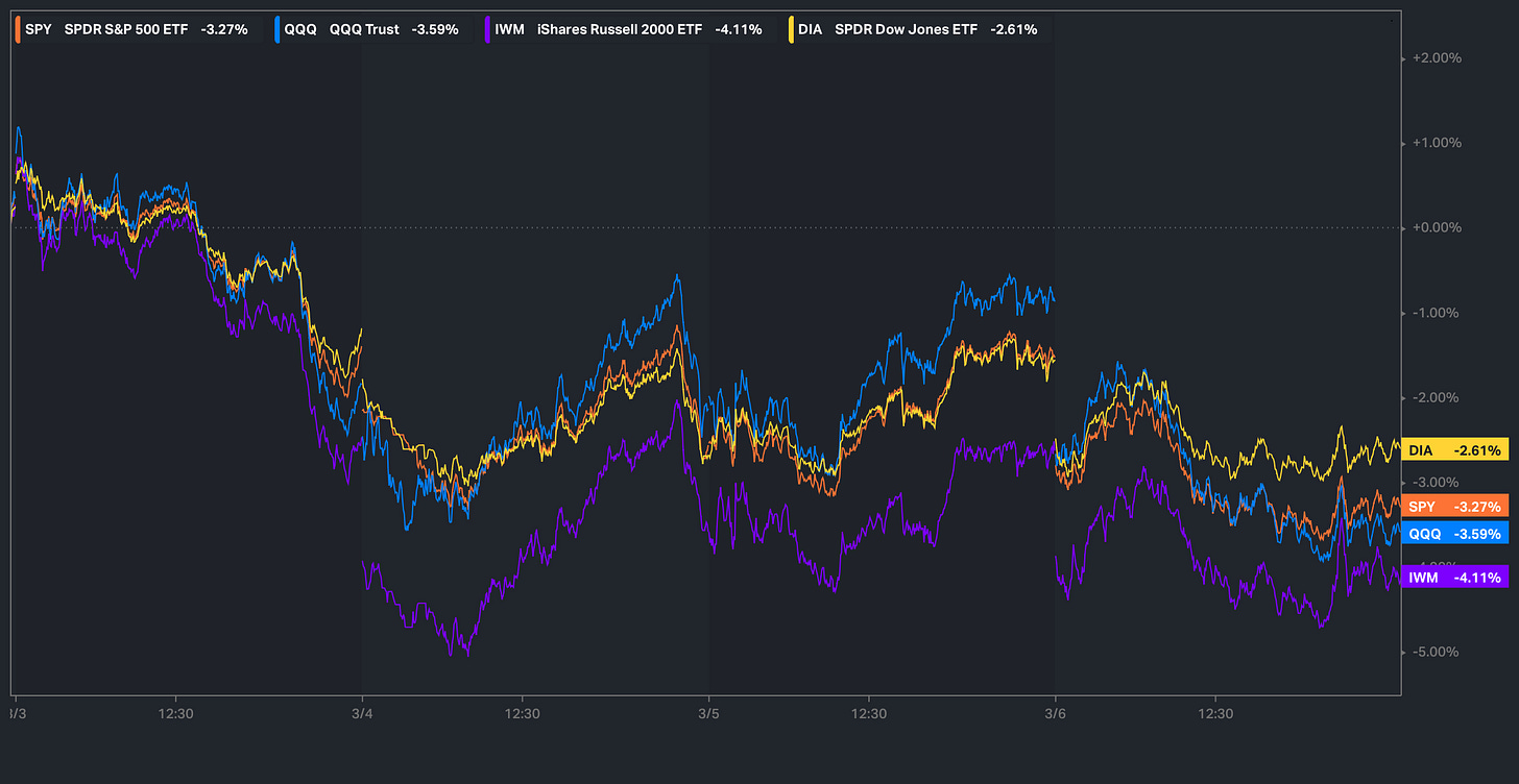 Thus far, small-caps have been the worst performing index on the week mostly driven by recent growth fears & uncertainties whereas the Dow has been the “best” performing index on the week although still sits lower by just over 250bps & a bigger driver of the recent outperformance has more so been attributed due to some of the components within the Dow being categorized as defensive / flight to lower beta trades.