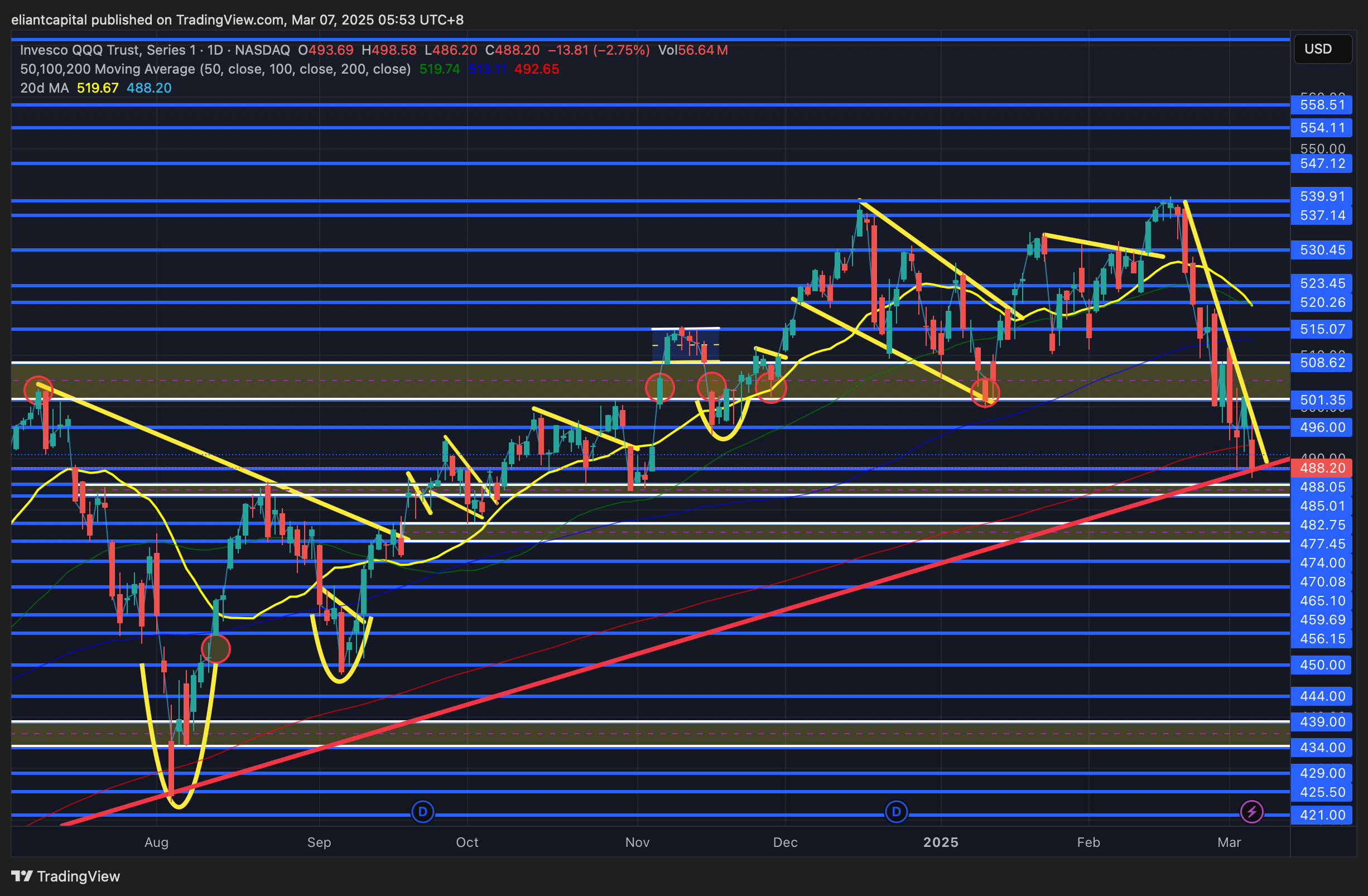 In respect to the Q’s, as of now, the Q’s closed just below the 200d whilst closing right on the support TL dating back to late ‘22 (Also sitting near pre-election levels so fairly big area of confluence)… still fairly simple from here, but pending tomorrows data, if we were to see the Q’s open with a gap-up tomorrow & it sticks following the jobs data, that likely signals the interim bottom has been established with an island bottom gap-up & that should generally lead the Q’s to revert higher towards the 501 / 508ish range above, but ultimately, until 508ish on the upside is firmly reclaimed, the Q’s still may be in for some more volatility / rallies may continue to get sold in the interim