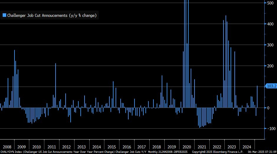 In adding on to recent growth fears, February Challenger job cuts surged to the highest level since ‘20 & was the largest spike since August ‘23… granted, jobless claims came in better than expected at 221k vs. 242k prior, but Challenger job cuts more so got all of the headlines as it tends to be a leading indicator & a big driver of the surge was due to DOGE cutting govt. / federal jobs.