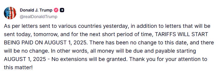 Well, considering Trump had threatened the EU with 50%+ tariffs prior by July 9th, IF this deal is true / confirmed, the 10% baseline across majority of EU goods is quite the softening of tone… & as we’ve discussed prior but the market really only cares about China / EU / Japan & partially Canada & Mexico as well… so again, 10% baseline would be quite the positive development & more so would emphasize towards other countries that if ‘Country X’ does act in good-faith with the U.S, the U.S. is happy to soften tone & give a fair deal instead of an extreme tariff %.