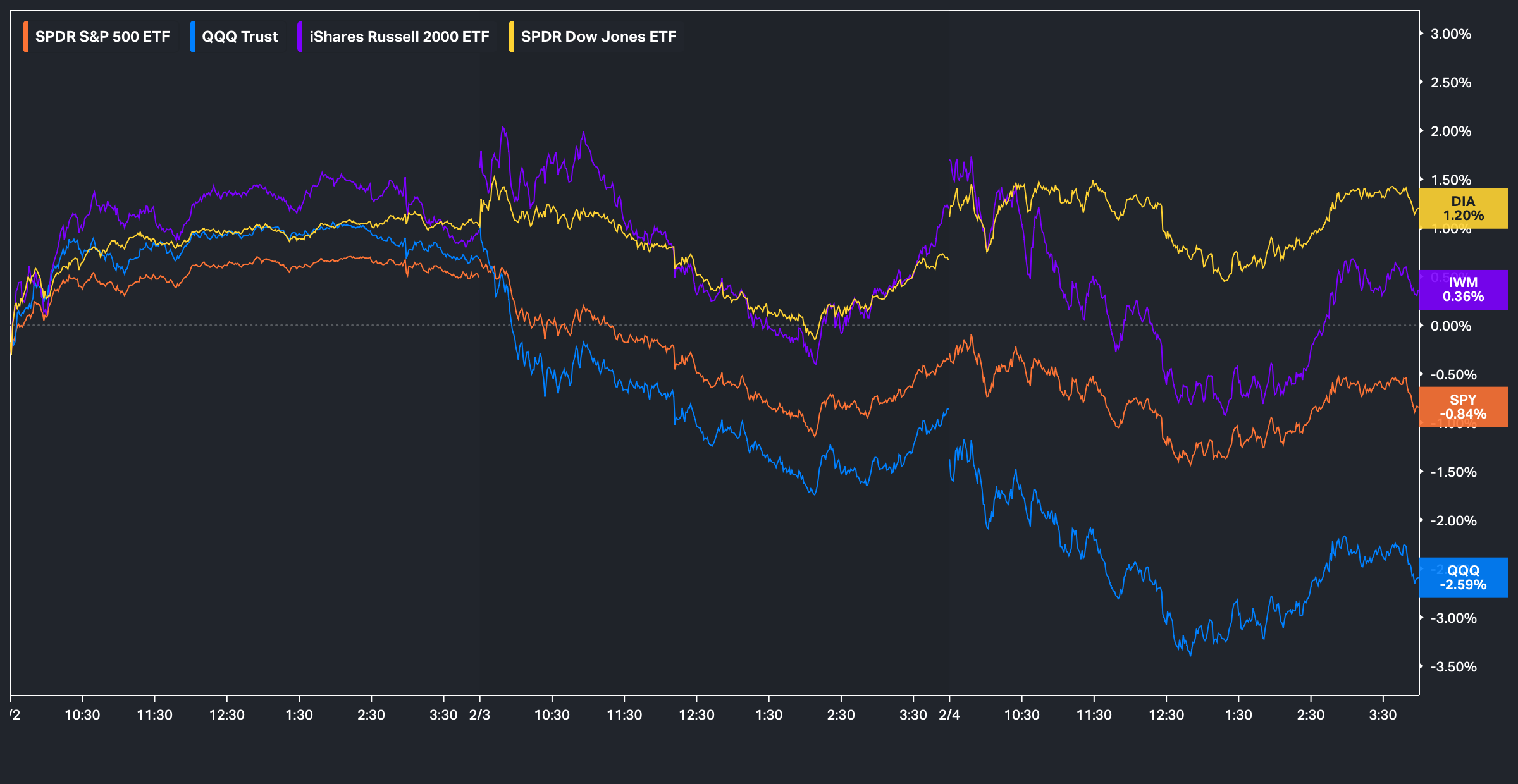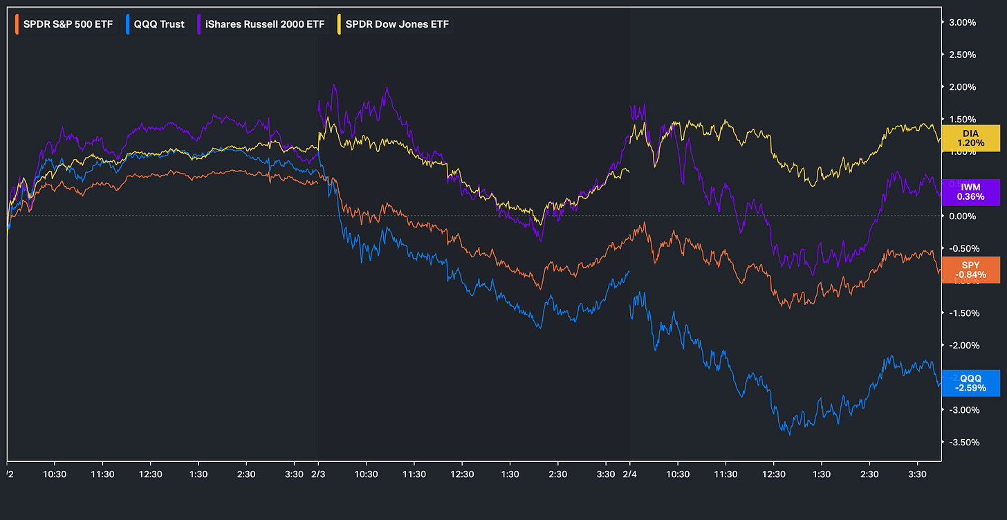 With that being said, on one hand of the market we’ve seen outperformance across Value, Cyclicals, and Equal-Weight, while on the other hand we’ve seen violent factor unwinds as the selling across SaaS and Tech, generally speaking, continues. Given this rotation and the renewed demand for Value and Cyclicals, the Dow and Small-Caps have been the best-performing indices on the week, whereas the Nasdaq has been the worst and currently sits lower by just over 250bps.