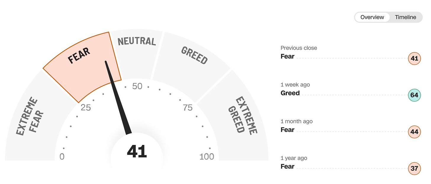 And the Fear-Greed index underscores the point just above as well as despite the % of stocks above the 20D & 50D remaining healthily in neutral territory, the Fear-Greed index has fallen back into ‘Fear’ territory after having briefly sat in Neutral-Greed territory for the last couple of weeks: