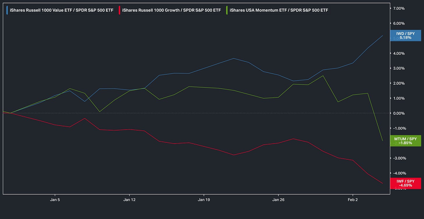Kicking right off into the recap, as we briefly touched on earlier but the general theme of the week has been an amplification along with the continuation of a rotation out of Growth to instead Value as the spread between the two groups has now grown to 10% Year-To-Date: