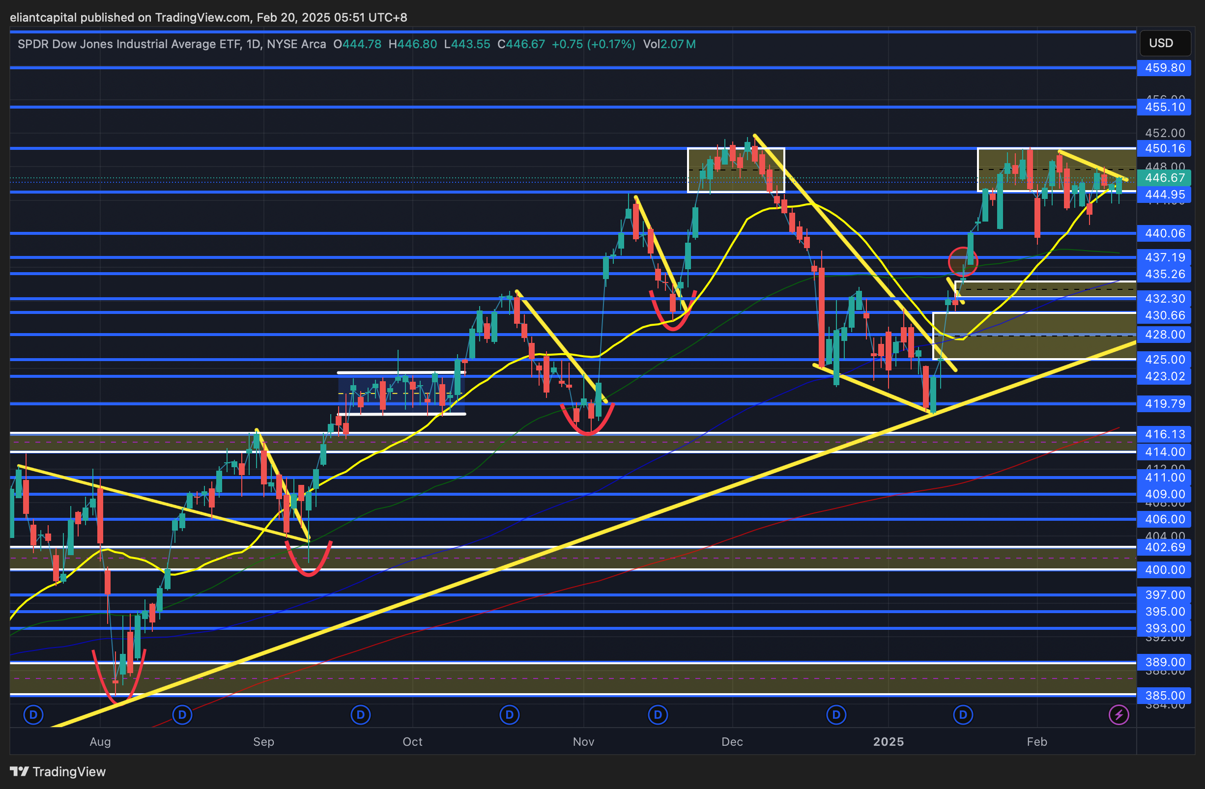 Out of all of the indices, I would argue DIA looks the most constructive for a firm breakout to new ATHs… DIA has been consolidating since early January & has remained well-contained within a very tight range between 450-444ish & ultimately, if we do see DIA break out of this flag & flip 450ish from resistance to support, it signals that higher highs are likely ahead on DIA, but otherwise, this recent rangebound action may persist as long as 450 continues to cap upside.