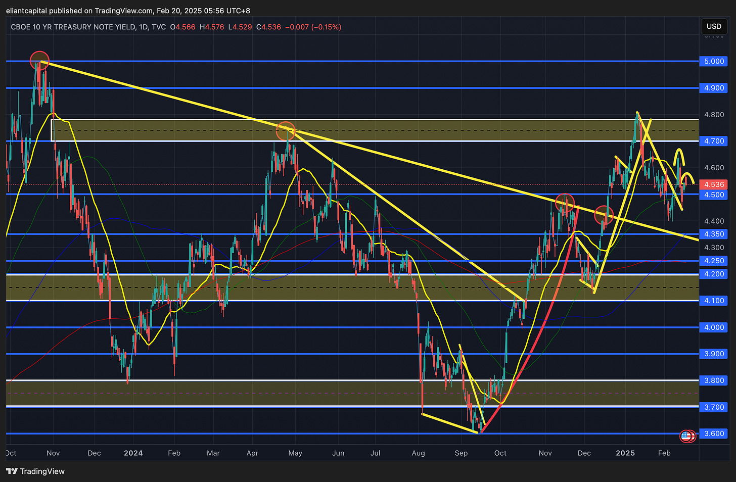 After today’s candle, it does indeed look like the 10Y did in fact establish another lower high, but ultimately, do still think we need to see a more firm breakdown through 4.5s (may come off of PCE #’s next week) as otherwise, the 10Y will likely continue to remain a bit more stubborn in the interim… do think a flush below 4.5ish does likely lead to a quicker test of 4.35s & ultimately, dollar pops continue to get sold & dips on bonds have continued to get bought which have been two major character changes that kicked off the moment Trump took over in office & the trends have remained. People have struggled with the bull-case for bonds, but ultimately, Trump wants lower energy prices / DOGE is looking to cut govt. jobs & spending / immigrants are being deported… two of the largest sources of job-creation & Trump trying to resolve inflation lower… all 3 being bullish bonds. The counter to this is IF inflation does continue to resolve higher & this recent data / rebound wasn’t a blip, it’ll end up being bearish bonds… but as of now, more so continue to reside with the former.