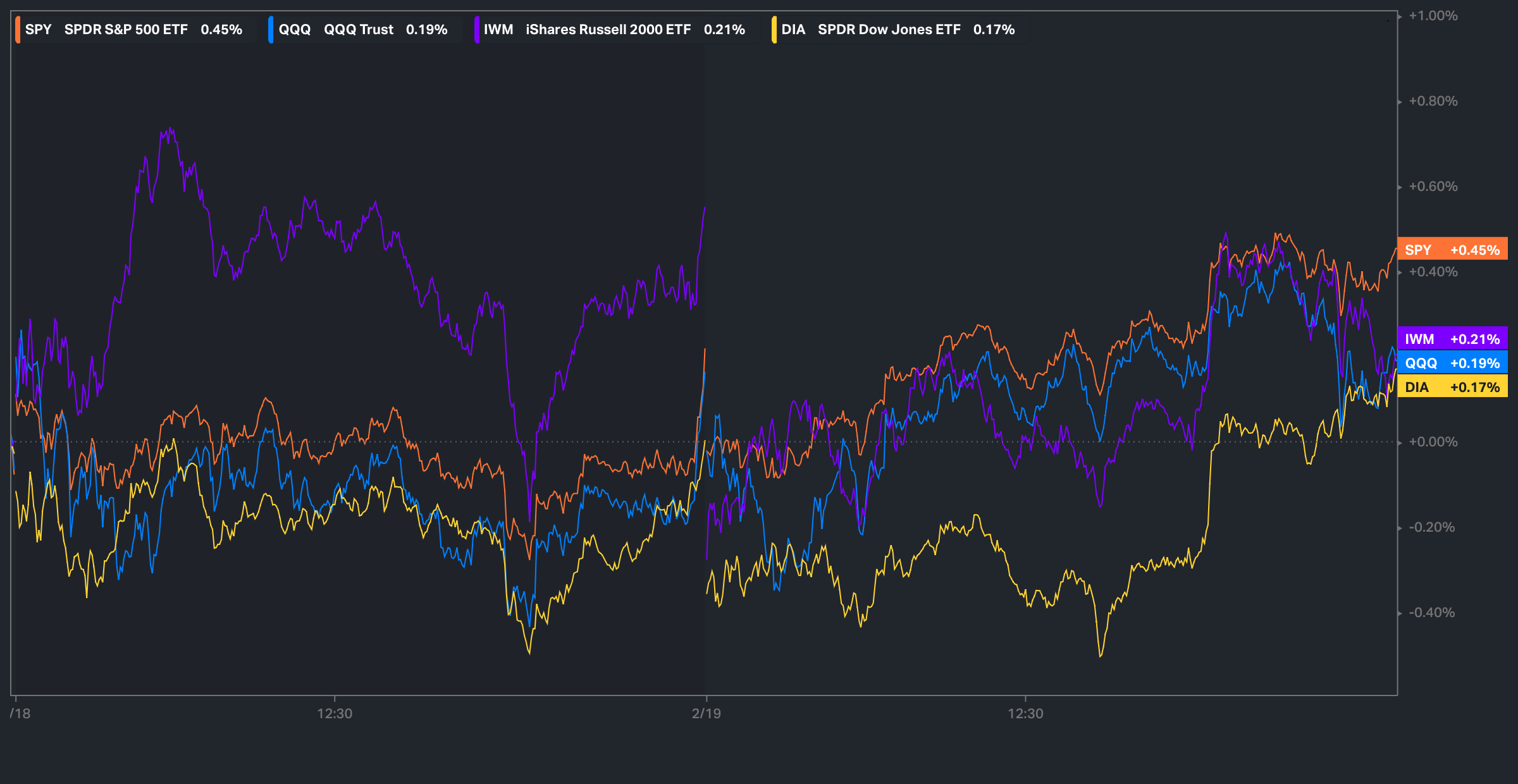It’s been a relatively quieter week given its a shortened one as markets were closed Monday for President’s day, but we also haven’t had much economic data of significance either, but as of now, Spooz is the best performing index on the week & ended up closing out at a new ATH today whereas the remaining indices are all essentially trading inline / up around 20bps on the week.