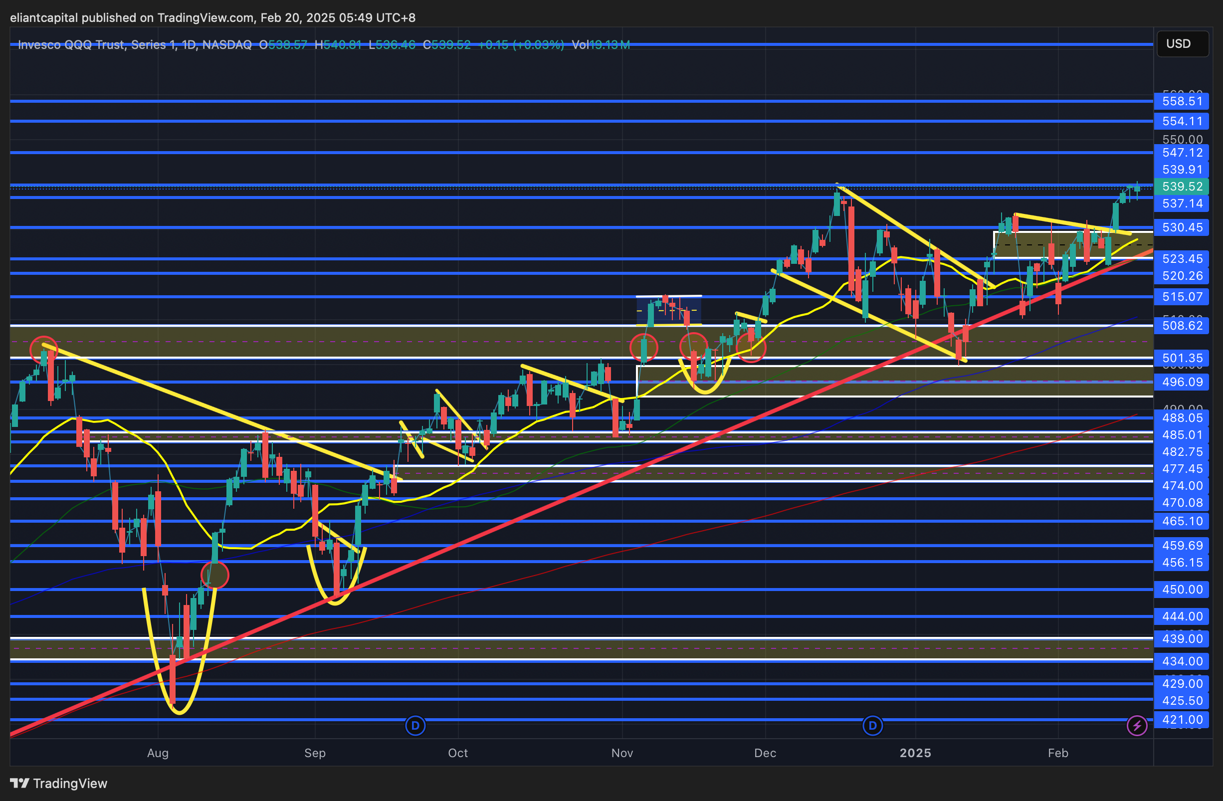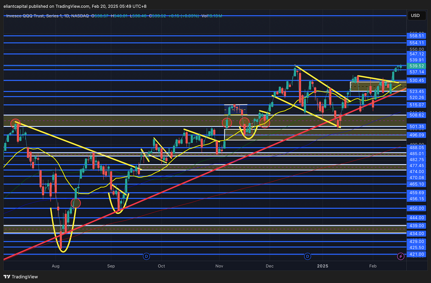 If we were to see this recent breakout falter / 530-532ish fails to come in as support, we could see the Q’s retrace right back lower towards the mid-520s (coincides with 20d / 50d) & if that were to falter, likely a flush towards the 100d near 510ish, but ultimately, the Q’s continue to look very constructive & after nearly 3 months of range-bound action, the Q’s look ready for an expansionary move to the upside as long as NVDA doesn’t disappoint next week.