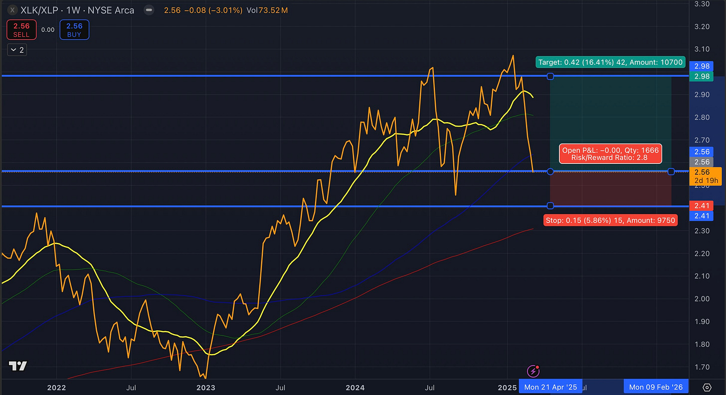 For a shorter-term reversion trade, I do think XLK/XLP will do very well on a countertrend rally bounce in tech… essentially long tech / short staples. Fairly simple thesis but tech is quite oversold here whilst staples are quite overbought… any sort of relief in equites will likely lead to an aggressive sell in staples / defensives & vice-versa in regard to a rush back into tech / momentum on any sort of positive headline.