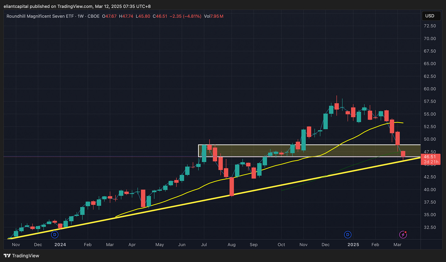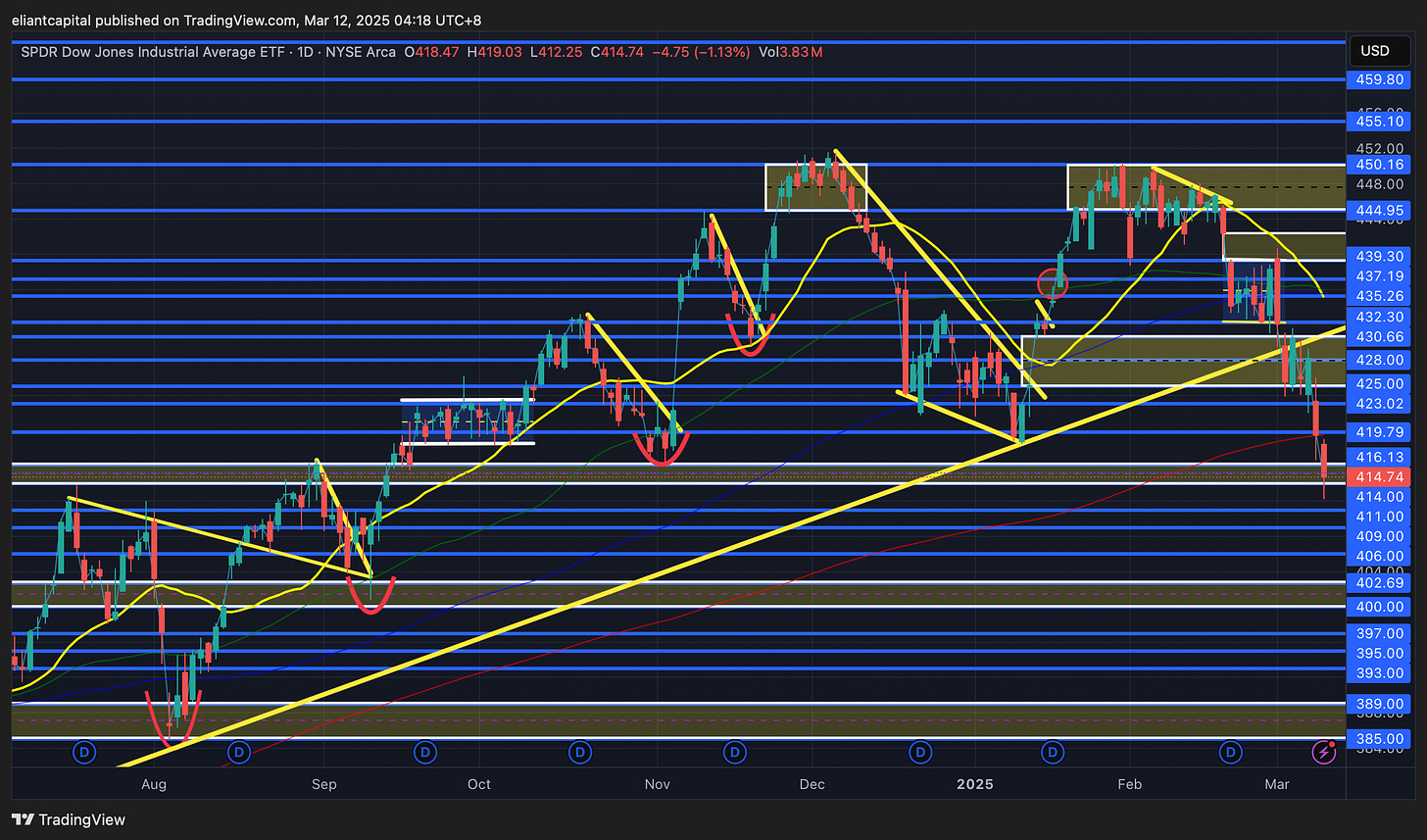 Similar story as with all of the indices, but we saw quite the decline in DIA which was the last index to break the 200d & now finally, all of the indices reside below the 200d. As of now, DIA has fallen back towards the Summer ‘24 highs which remains as a general important pivot as it has potential to be a S/R flip (prior resistance flipping to support). Again, doesn’t need to be said but all of the indices remain very extended to the downside & if we were to see a countertrend rally in DIA, I do think we could see DIA backtest 430 / 432ish above before then pausing & or deciding where to go from there… a lower high & or resume towards ATHs?
