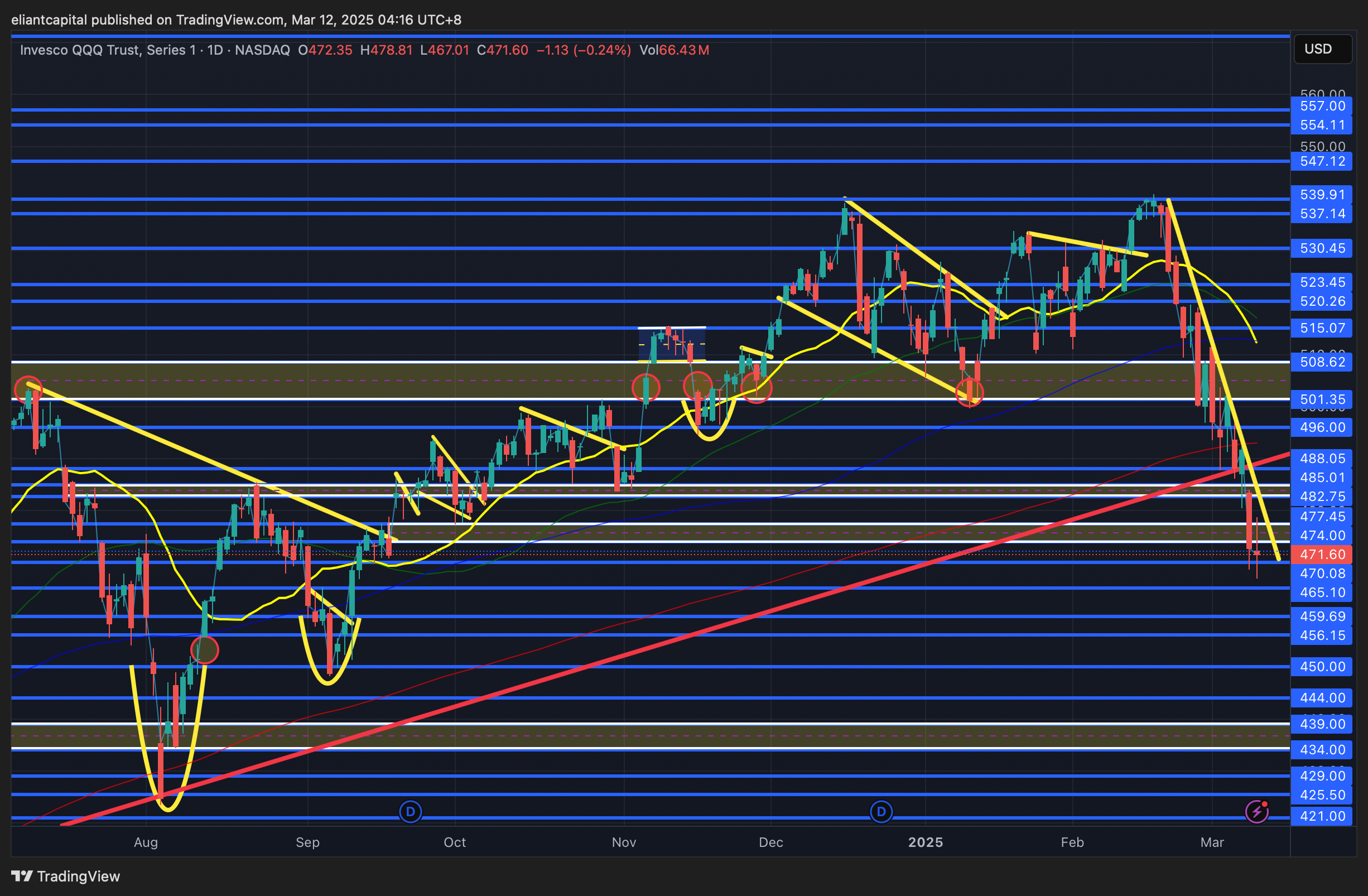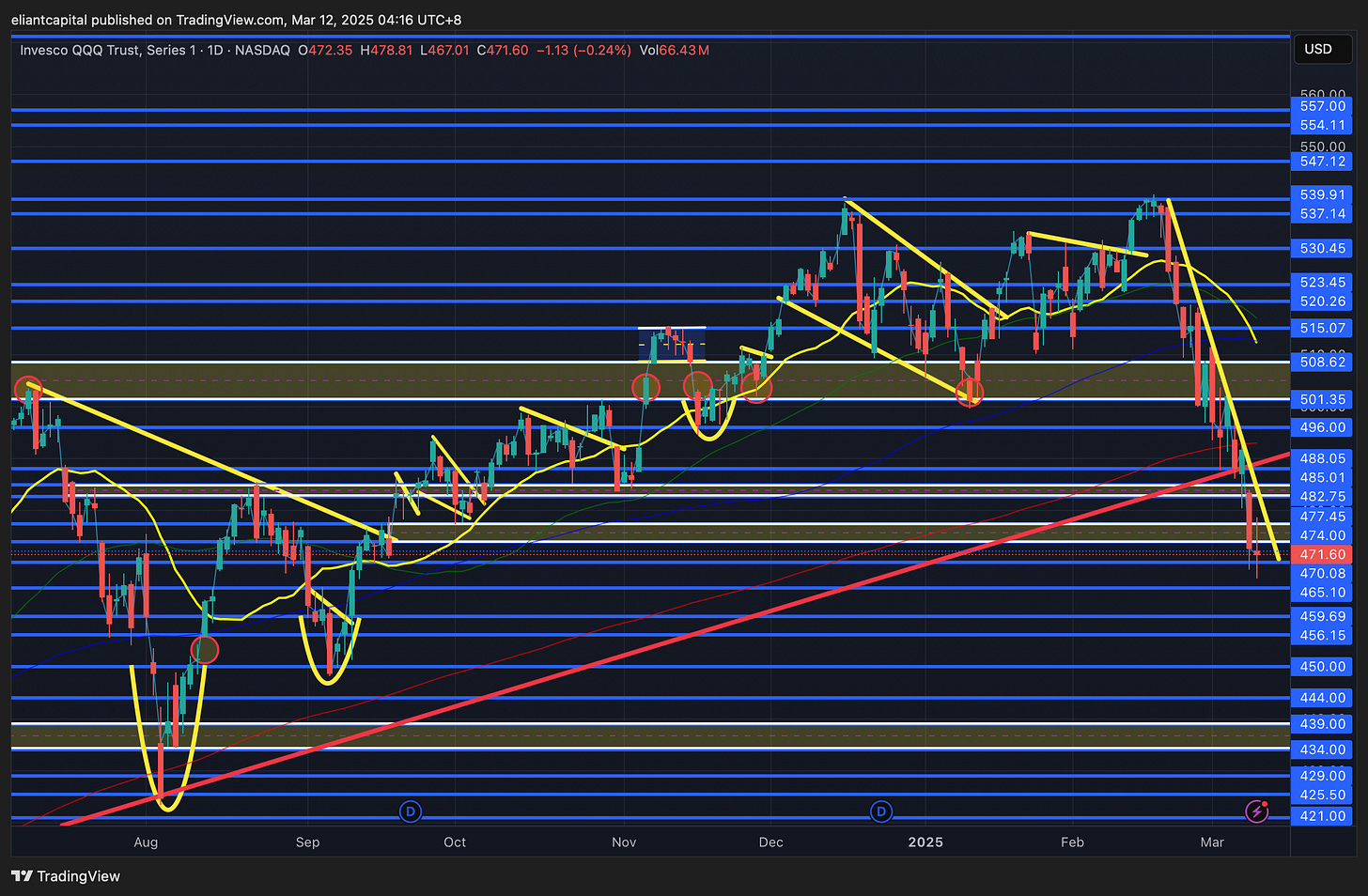 In respect to the Q’s specifically, as of now, the Q’s filled the gap from this past September & more so have been oscillating just slightly below this gap-fill. Do think 465 / 470ish on the Q’s is a fairly important pivot & given how oversold the Q’s are, a snapback rally would likely precede a move towards 496 / 501ish above whereas the Q’s continuing to fail to find support may lead the Q’s to slip towards the earlier on September gap just below near 456ish which just nearly coincides with the September ‘24 higher low bottom as well after forming the bigger bottom in August ‘24 (Carry trade unwind bottom)… not the base case, as again, things are quite extreme at these levels… plenty of oversold readings / % of stocks below key MAs etc… but if the uncertainty surrounding policy remains / no positive headlines are given to the market, the volatility will likely remain for now in the interim.