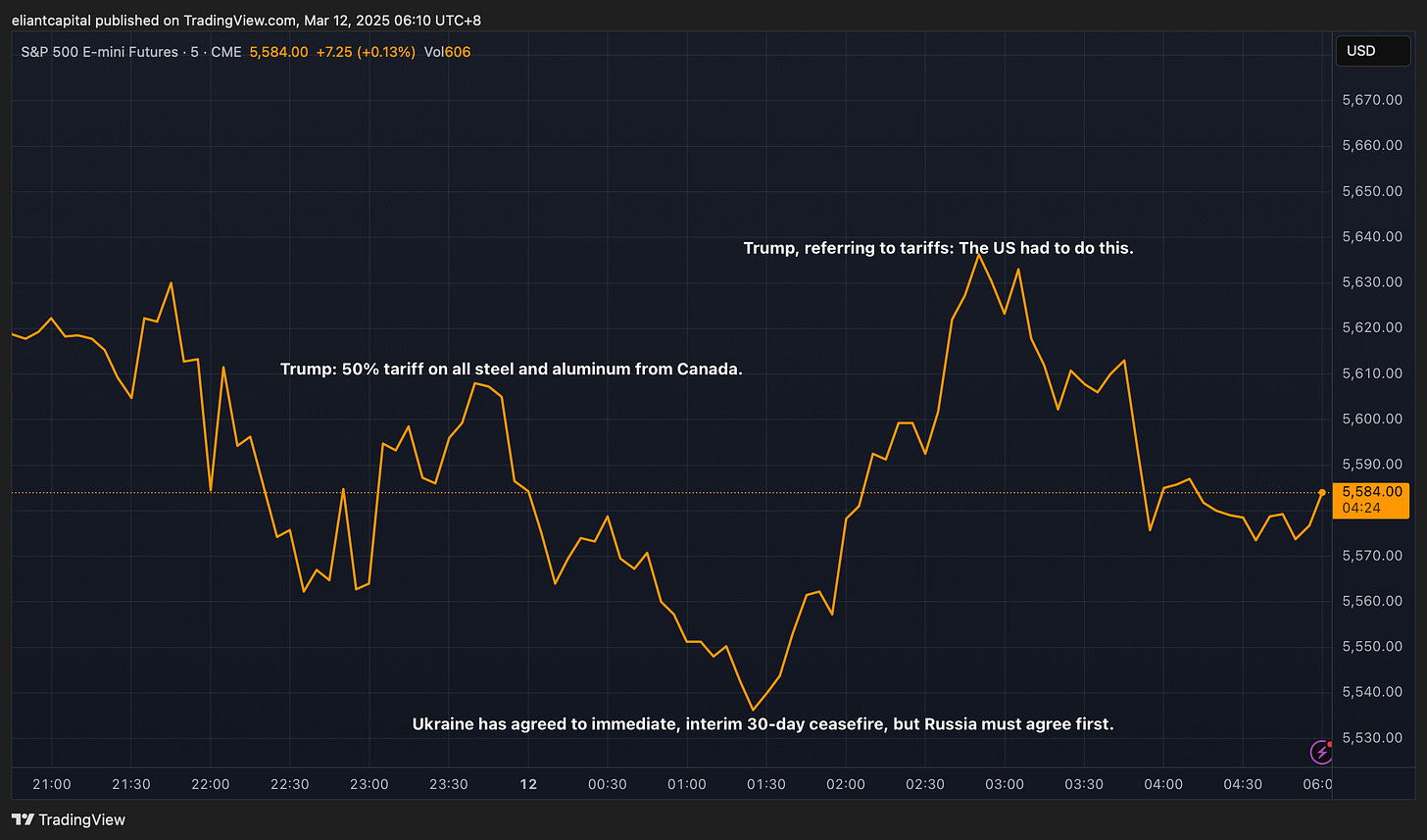 The headline driven madness continues as the initial decline in the indices kicked off yesterday which was mostly driven by a Fox Business interview from Trump over the weekend as uncertainties in regard to policy remain & then today, Trump came out shortly following market open stating that an additional 25% tariff on all steel & aluminum from Canada will be enacted tomorrow on the 12th (total of a 50% tariff) which created further uncertainties leading to an intraday decline before we finally saw indices make a low following a temporary ceasefire headline out of Ukraine.