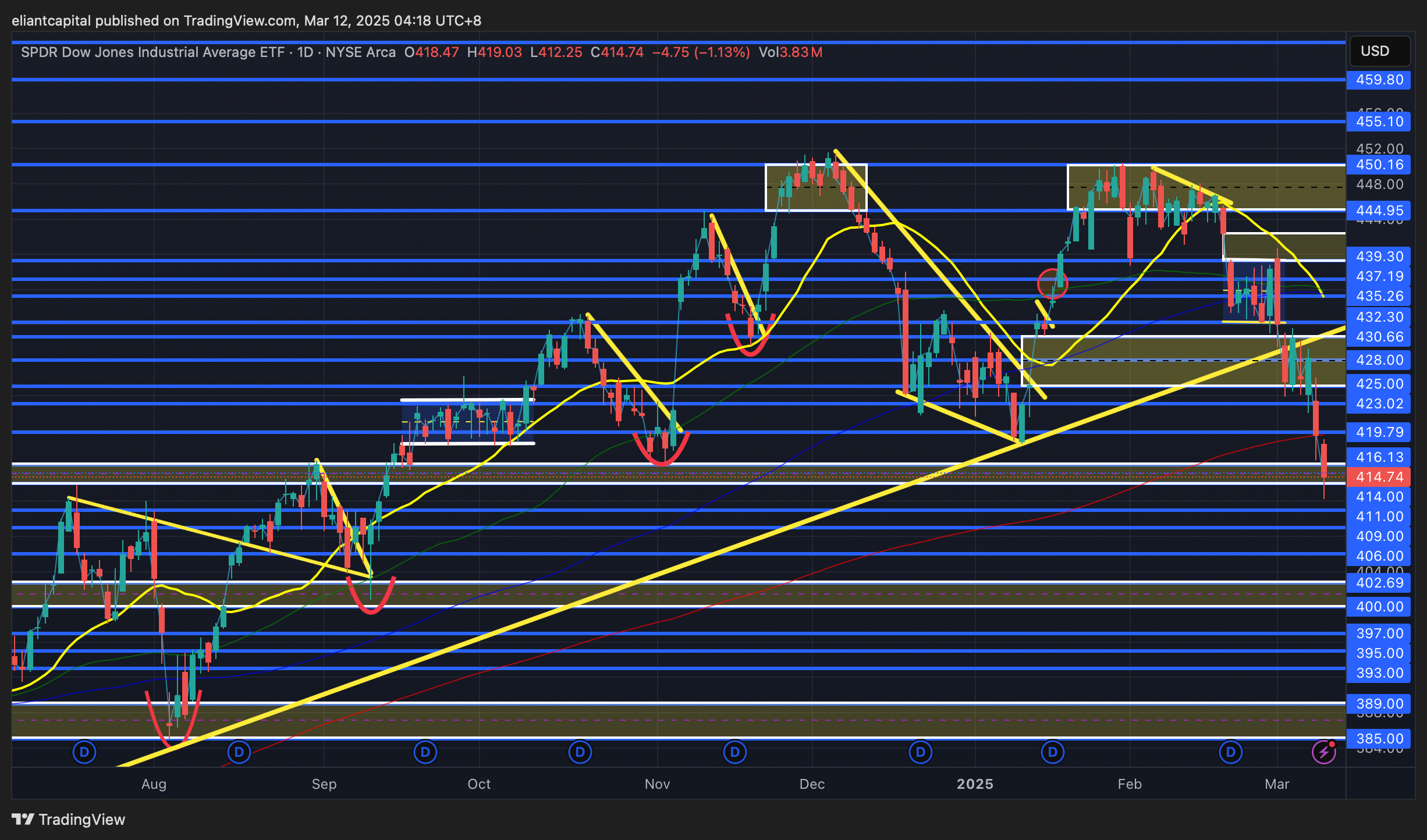 On the contrary, if we were to see DIA continue to fall, the next bigger line of support is around 402 / 400ish which coincides with the September ‘24 lows but in general, barring a collapse due to a headline / outlier event, do think DIA is nearly at the point of reaching extension to the downside before a countertrend rally unleashes.