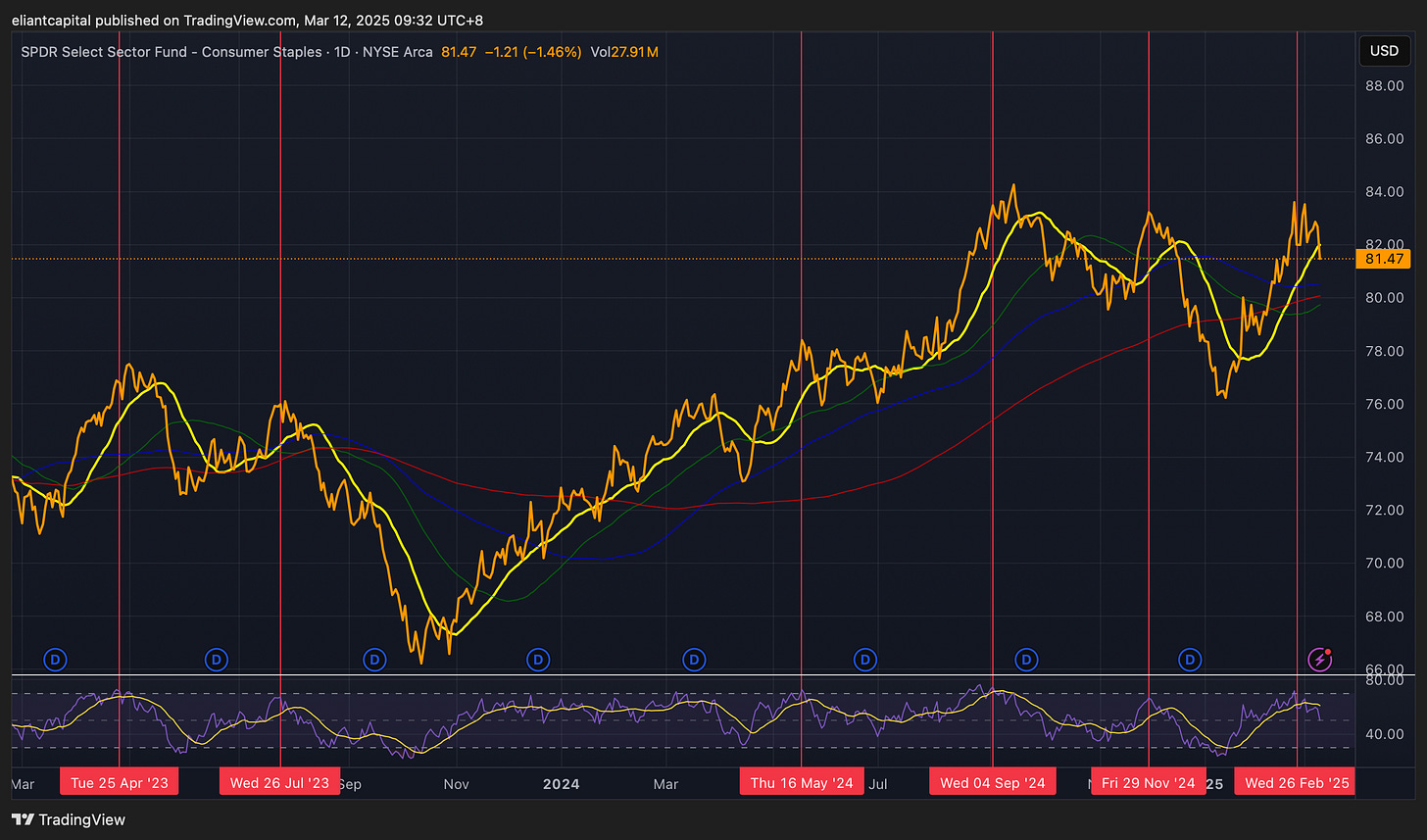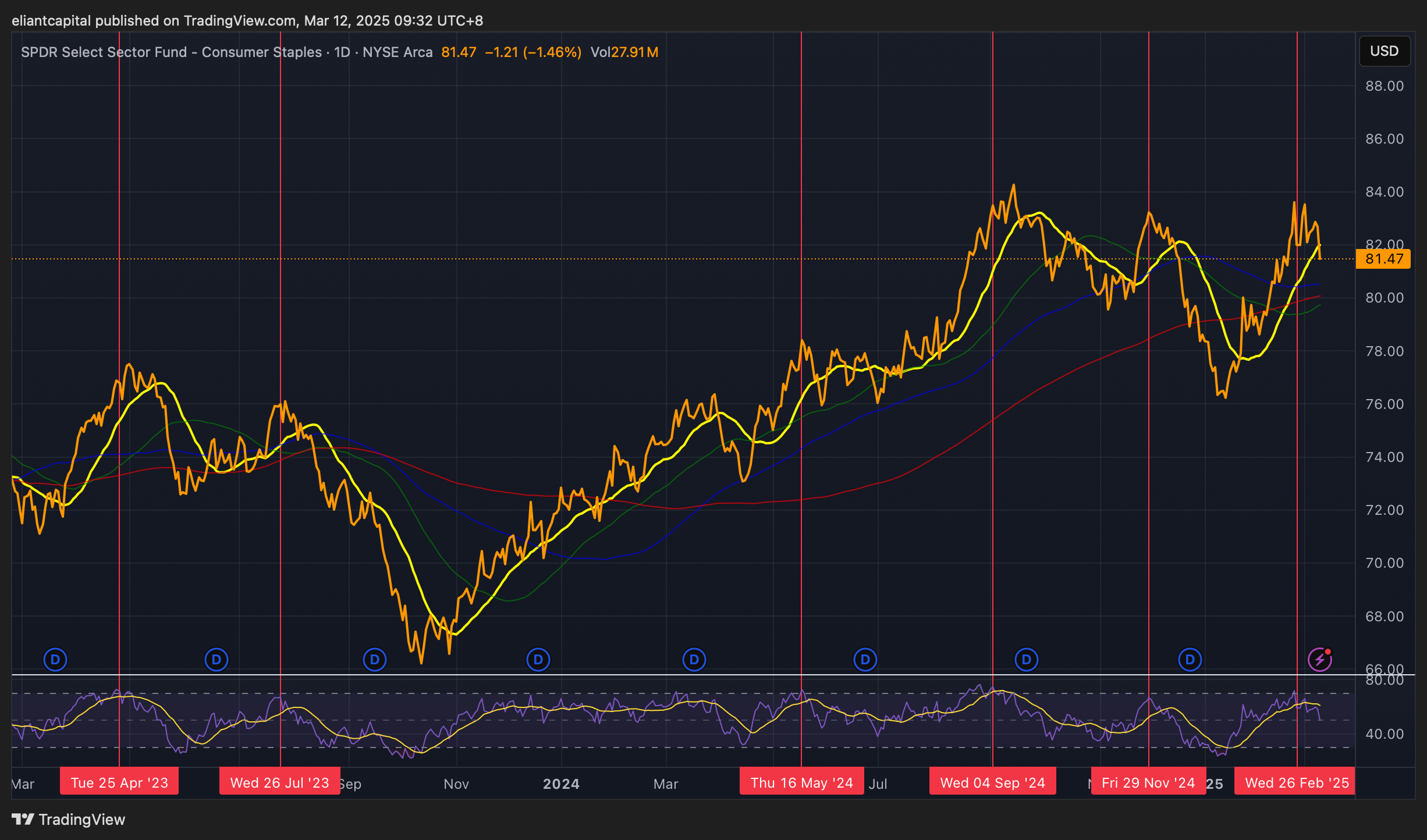 Prior instances where XLP was overbought (started to roll over today due to the slight relief in tech):