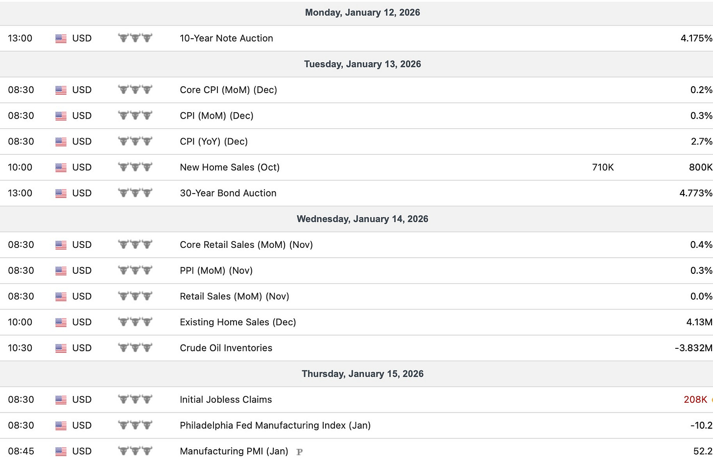 In regard to economic data into the upcoming week, with 2026 full-steam ahead, we have a few set of more ‘important’ datapoints including CPI / Retail Sales / PPI #’s, but generally speaking, odds for a January cut sit at 4% & April rate-cut hopes got pushed back to June, so this weeks upcoming data arguably doesn’t hold too much weight & if anything, if the data happens to be softer than expected, we could see markets back to pricing in an April cut, but otherwise, the ‘potential’ surprises seem relatively limited & what’ll be more important into month-end is whom does Trump select as the next incoming Fed-chair.