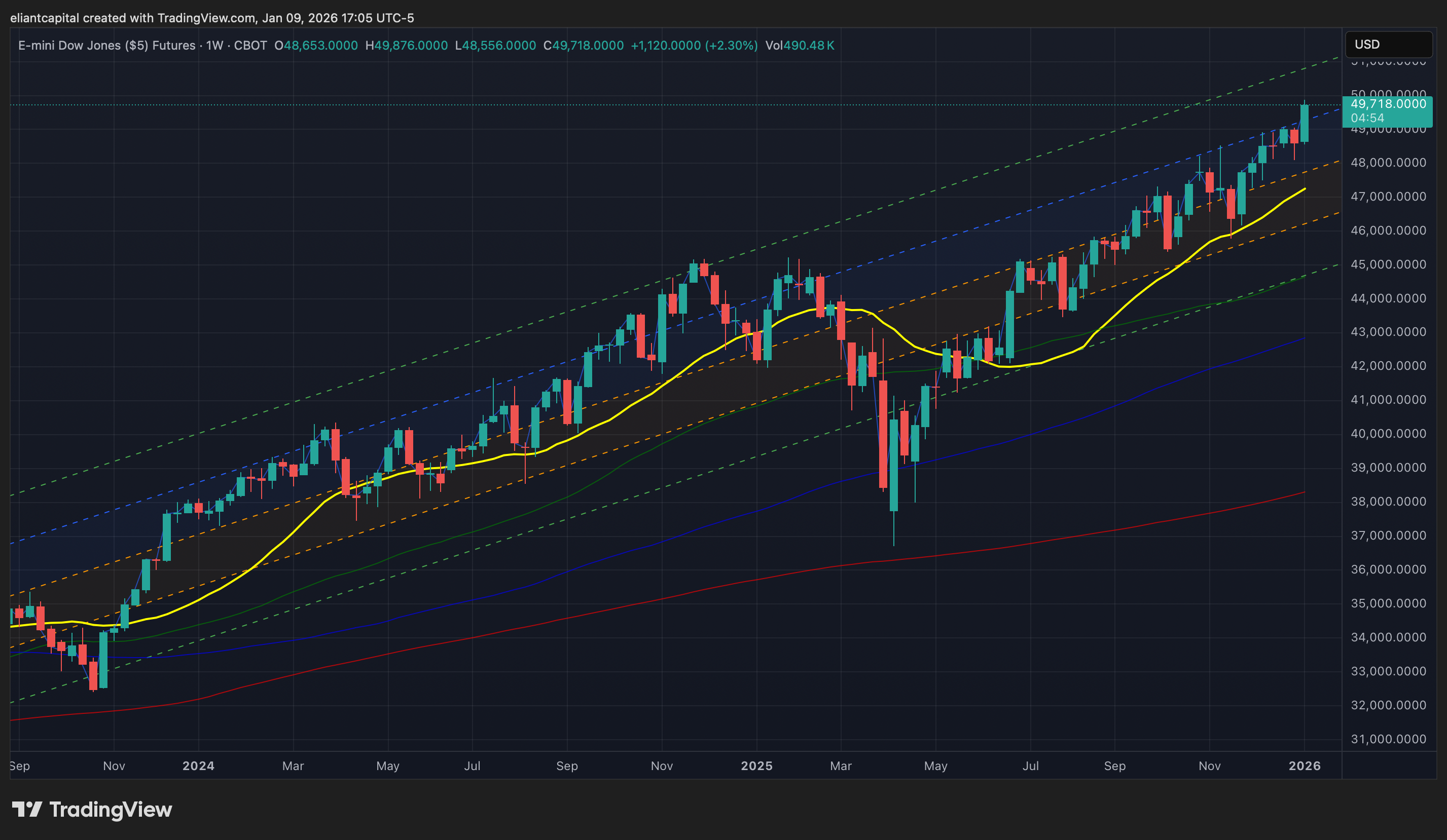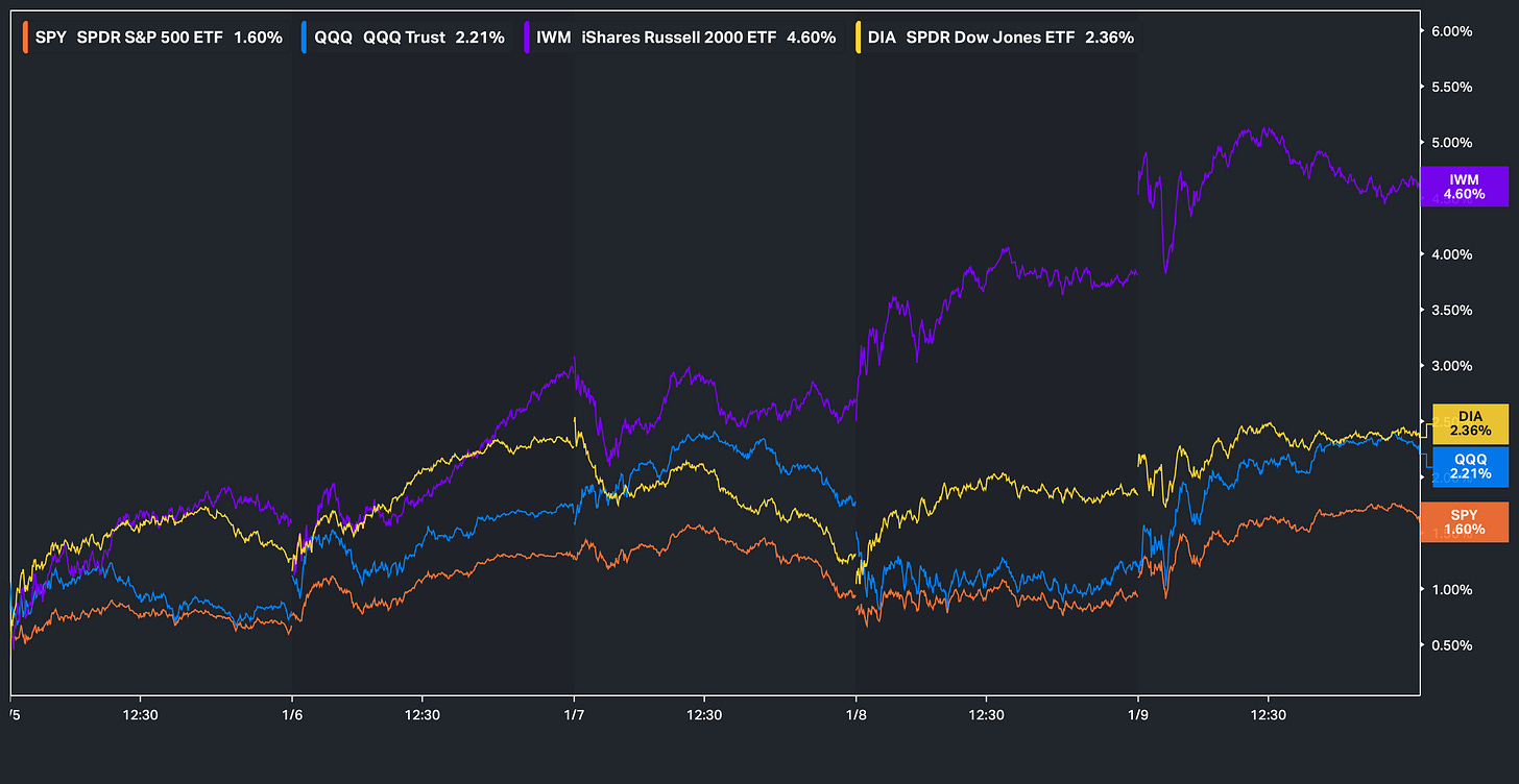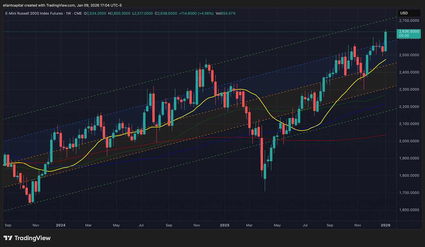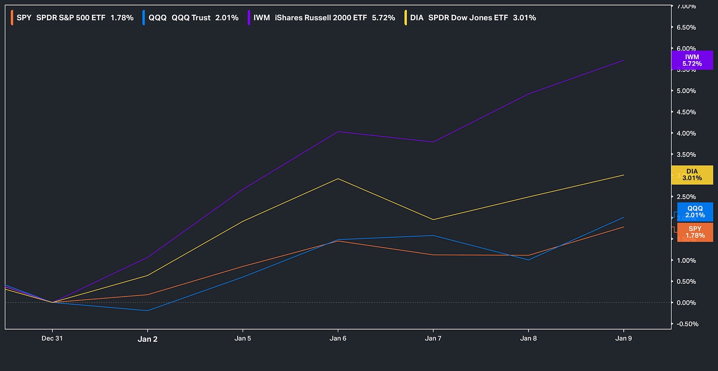 Looking back at this past week, we finally made it through the first ‘real’ trading week of the year & it didn’t disappoint but in regard to economic data, for the most part, the recent ‘Goldilocks’ regime got rehashed even further although signals are starting to accumulate & are slowly pointing toward an economic re-acceleration. Having said that, in the interim however, given the generally ‘Goldilocks’ backdrop, Small-caps were the best performing of the indices on the week, having closed higher by 460bps, whereas Spooz was the ‘worst’ performing of the indices yet still closed higher on the week by 160bps.